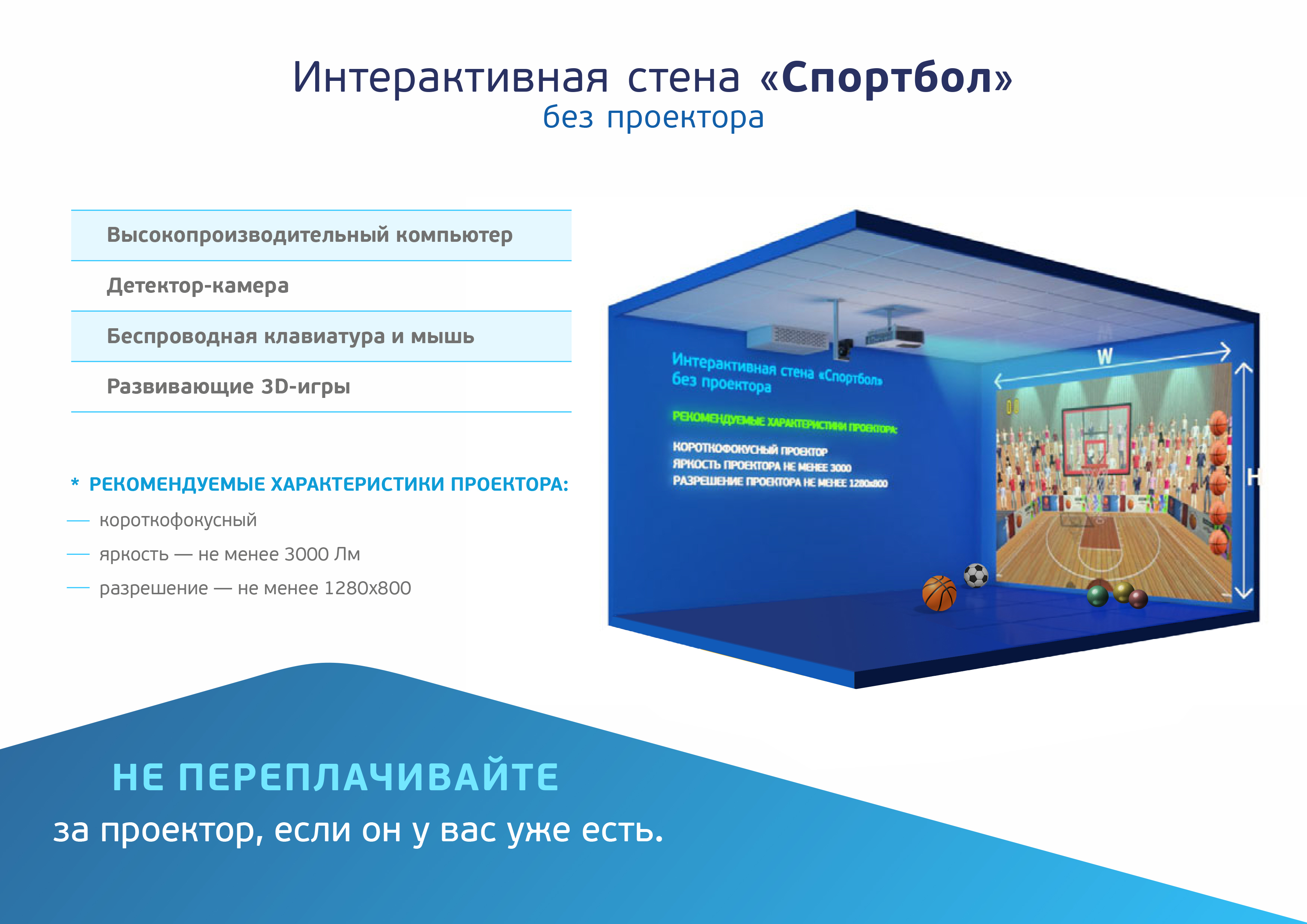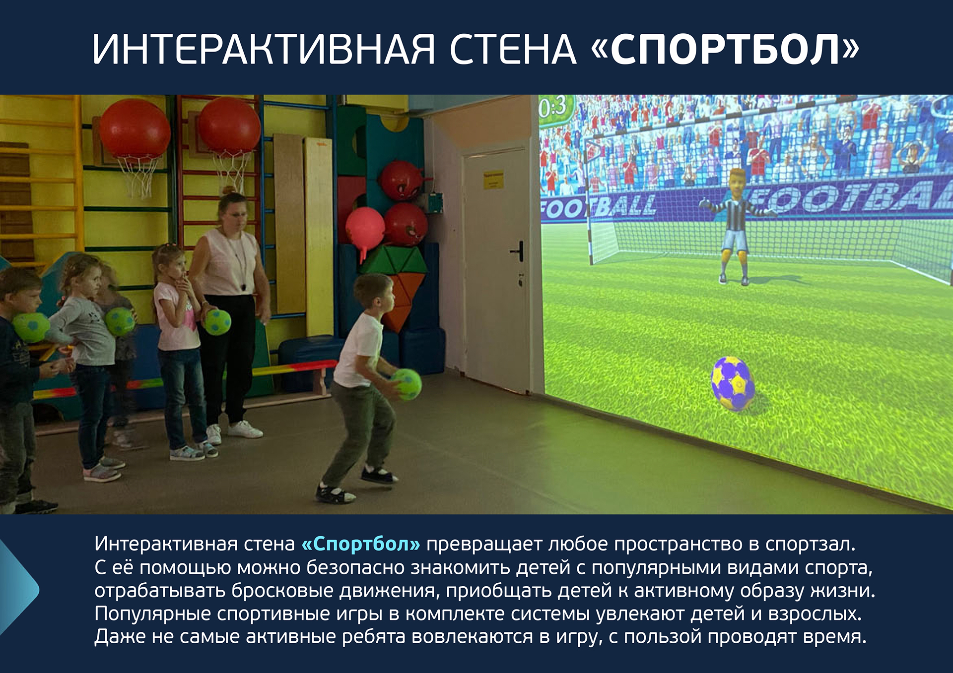 Спортбол превращает любое пространство в интерактивный спортзал. С его помощью можно безопасно знакомить детей с популярными видами спорта, отрабатывать бросковые движения, приобщать детей к активному образу жизни. Популярные спортивные игры в комплекте системы увлекают детей и взрослых. Игры имеют как соревновательный, так и командный режимы. СПОРТБОЛ обеспечивает полезный, интересный досуг и воспитывает коллективный дух! Подробнее