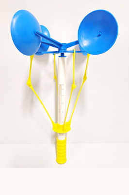 Прибор изготовлен из пластмассы и состоит из горизонтальной крестовины с 4 полусферами (тарелки), обращенными выпуклостью в одну сторону и основания - ось с измерительной шкалой.