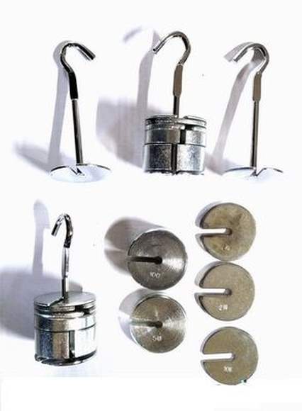 Грузы изготовлены из металла в форме дисков, каждый диск промаркирован по массе 3 шт. по 100г, 3 шт. по 50г, 6 шт. по 20г, 3 шт. по 50г, плюс стержень с грузом и крючком 20г 4 шт.