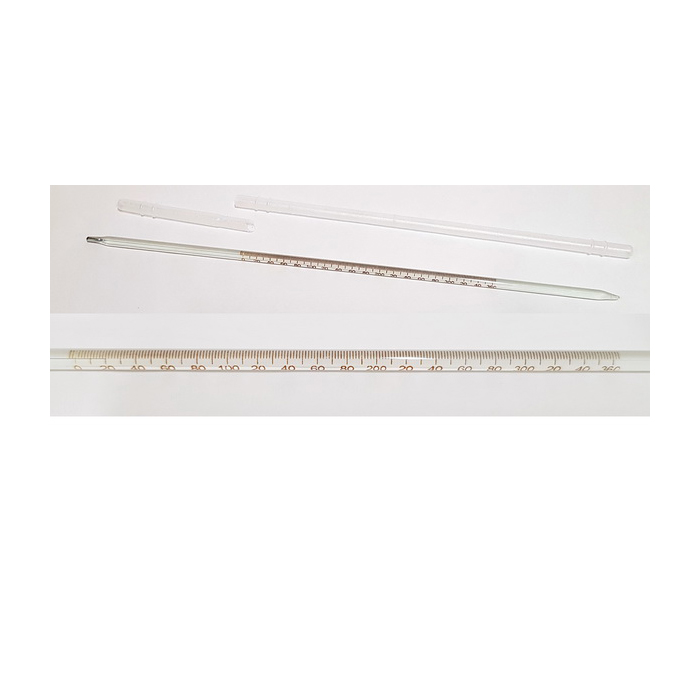Термометр представляет собой стеклянную оцифрованную трубку с впаянным капилляром и баллоном со ртутью. Пределы измерения от 0ºС до +360ºС, цена деления шкалы 2ºС, длина термометра (мм): 295, диаметр (мм): 5 ±1. Применяется при проведении лабораторных работ по калориметрии, удельной теплоемкости воды, температуры кипения различных жидкостей и др.