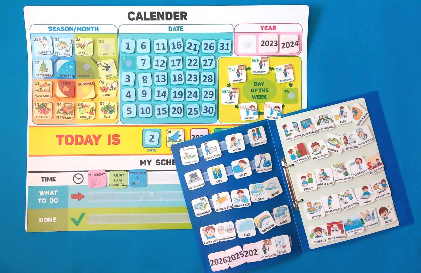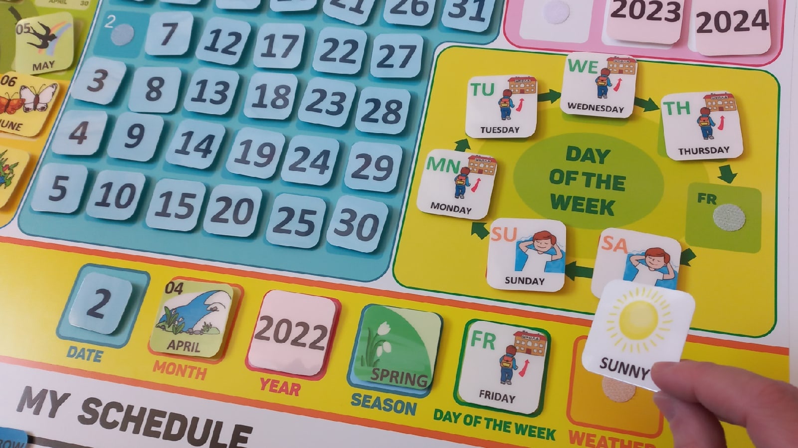2. 100 пластиковых карточек: дни недели, погода, времена года, месяцы, года, карточки для распорядка дня