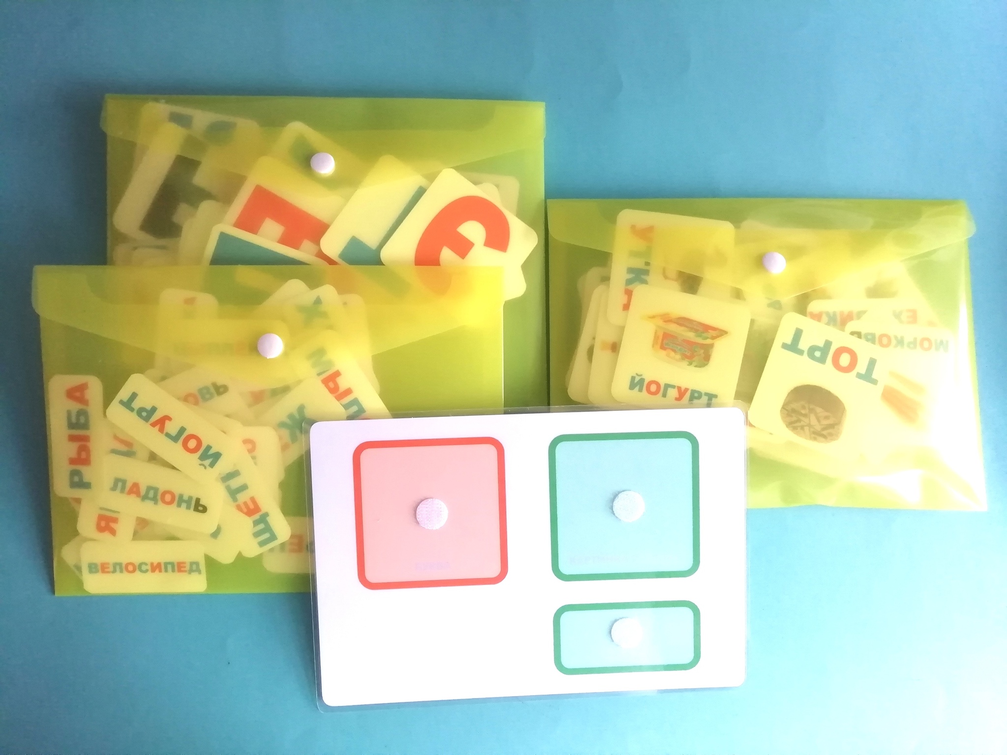 - 33 карточки со словом на каждую букву алфавита и картинкой (размером 6*6 см)