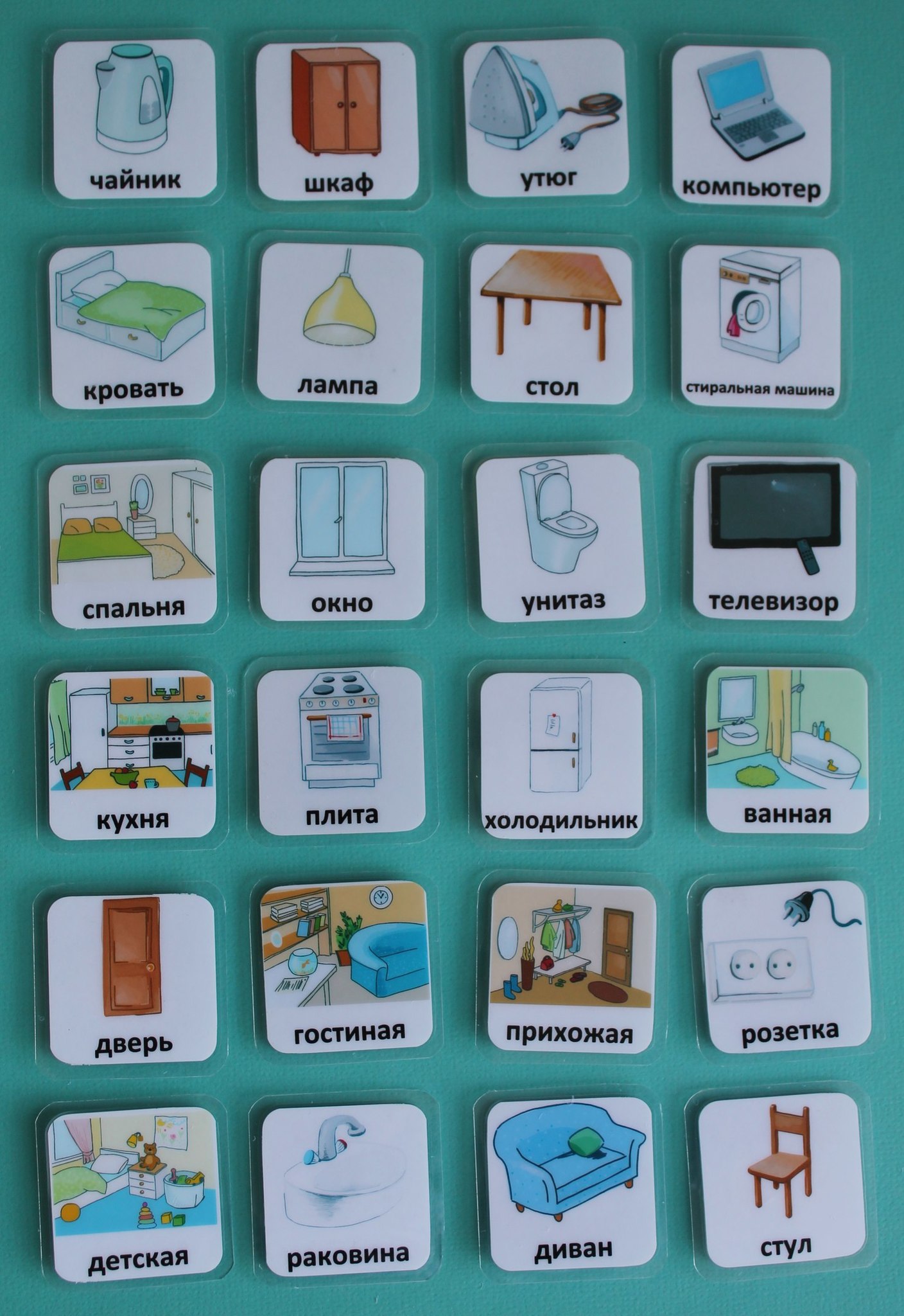 1. Кухня, 2. Спальня, 3. Прихожая, 4. Гостиная, 5. Детская, 6. Ванная , 7. Диван, 8. Стол, 9. Шкаф, 10. Плита, 11. Утюг, 12. Чайник, 13. Компьютер, 14. Телевизор, 15. Стиральная машина, 16. Раковина, 17. Унитаз, 18. Розетка, 19. Окно, 20. Дверь, 21. Лампа, 22. Холодильник, 23. Кровать, 24. Стул