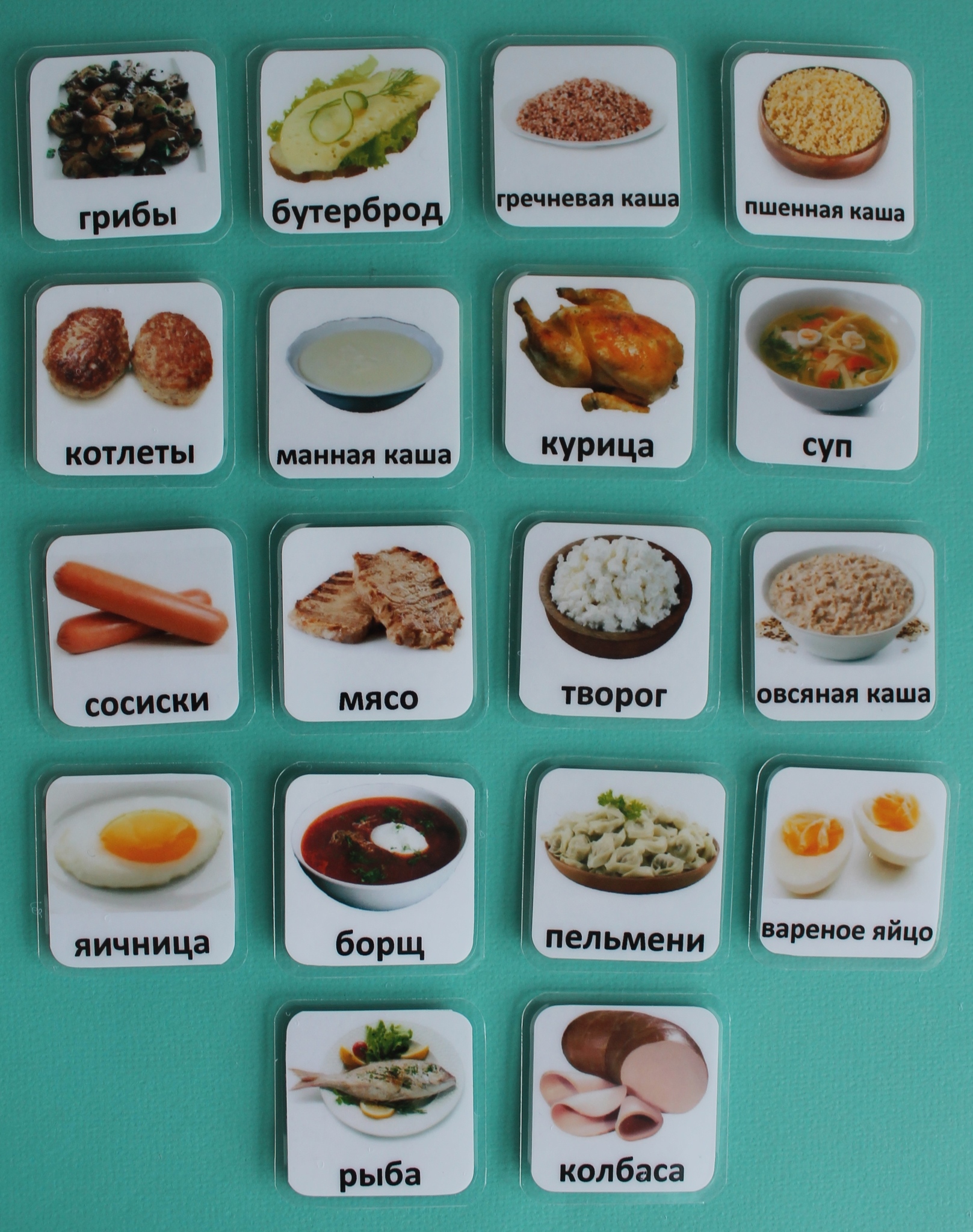 В комплект входят: суп, мясо, курица, сосиски, колбаса, котлета, пельмени, рыба, борщ, грибы, овсяная каша, гречневая каша, пшённая каша, варёное яйцо, бутерброд, яичница, творог, манная каша.