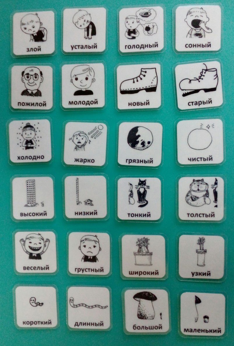 В комплект входят: большой, маленький, толстый, тонкий, широкий, холодный, высокий, низкий, чистый, узкий, грязный, веселый, жаркий, грустный, голодный, короткий, длинный, злой, усталый, сонный, молодой, пожилой, новый, старый