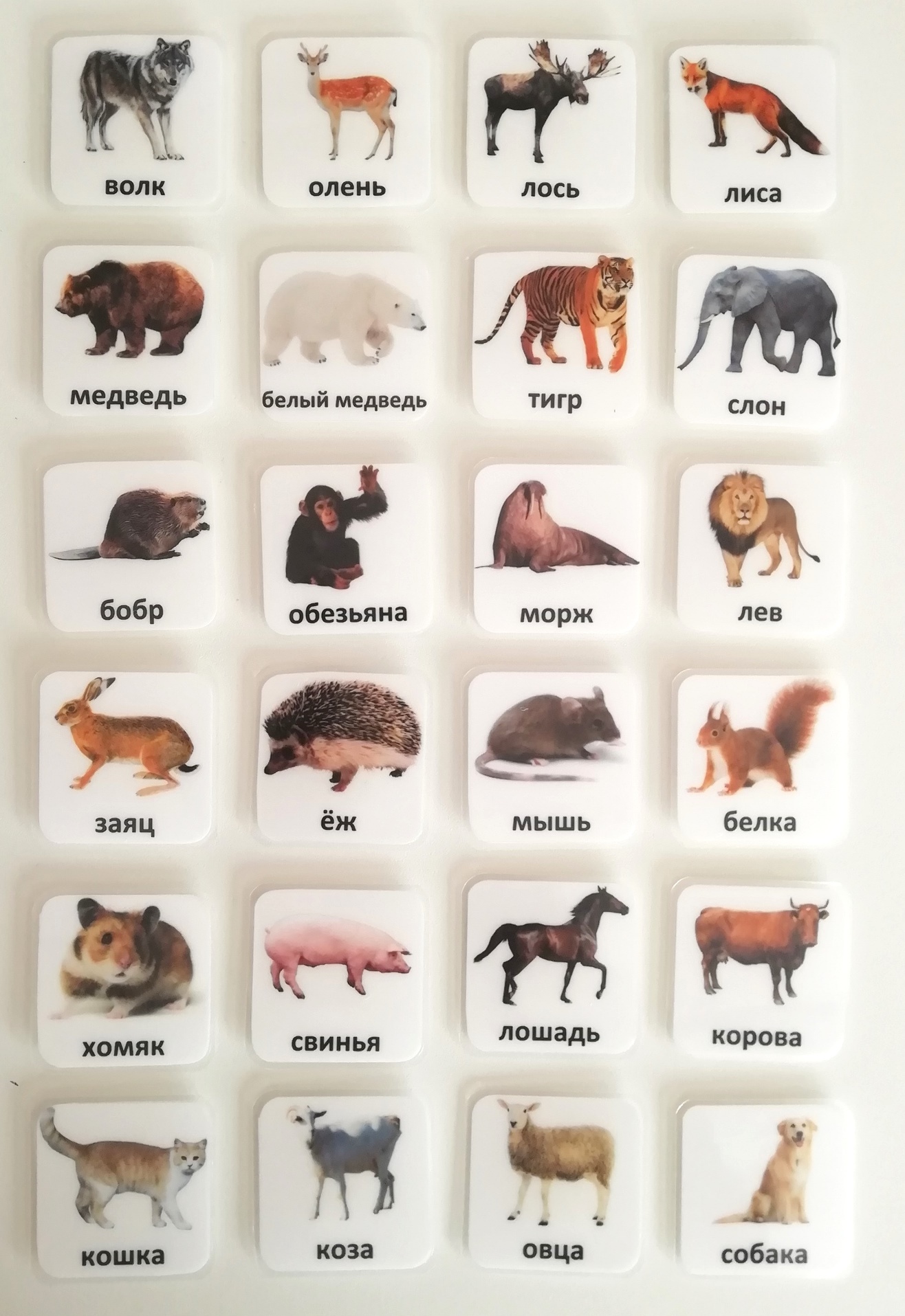 ЖИВОТНЫЕ: волк, олень, лось, лиса, медведь, белый медведь, тигр, слон, бобр, обезьяна, морж, лев, заяц, ёж, мышь, белка, хомяк, свинья, лошадь, корова, кошка, коза, овца, собака.