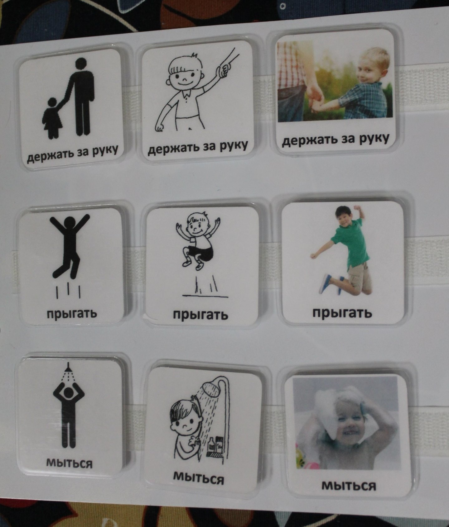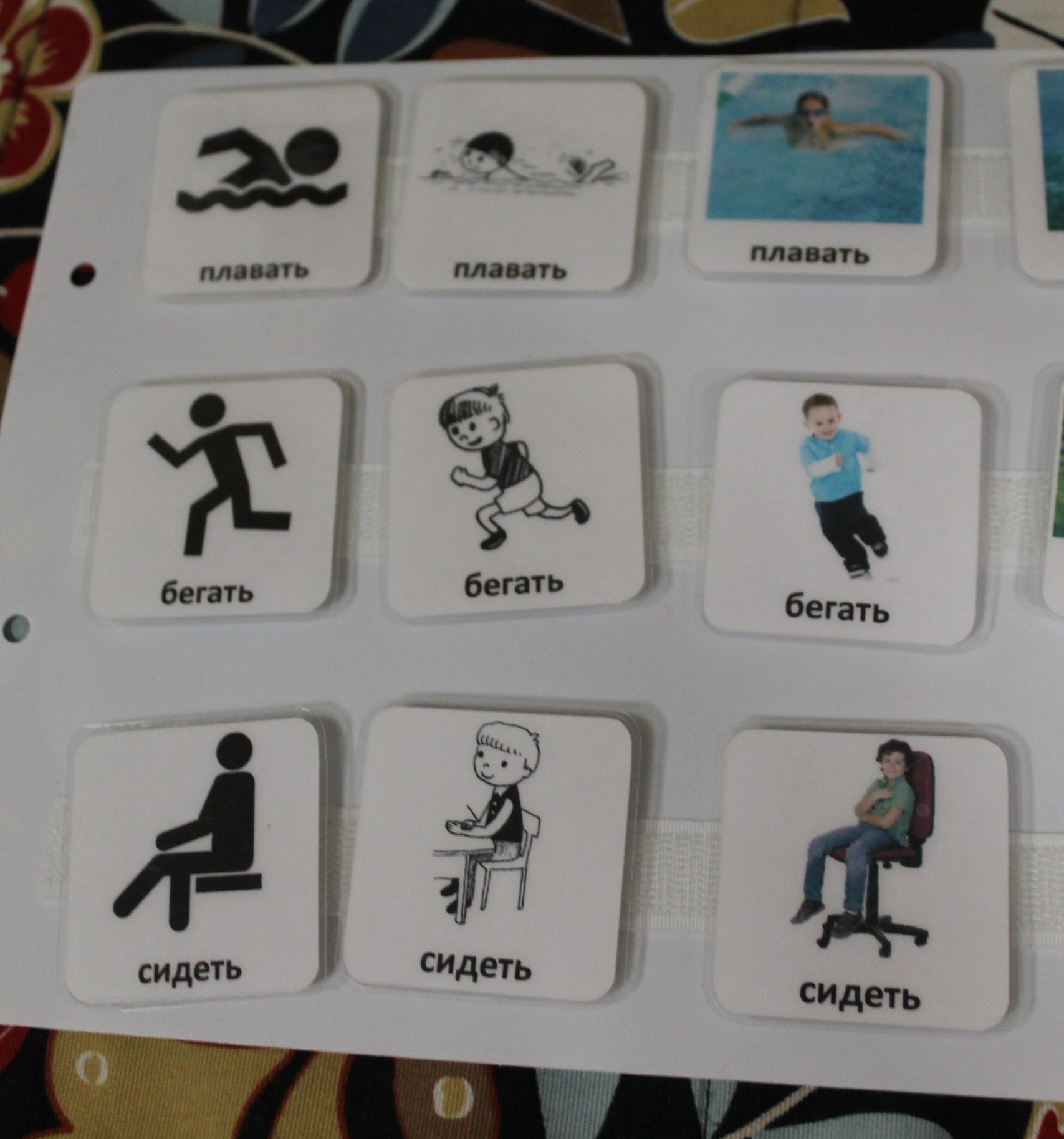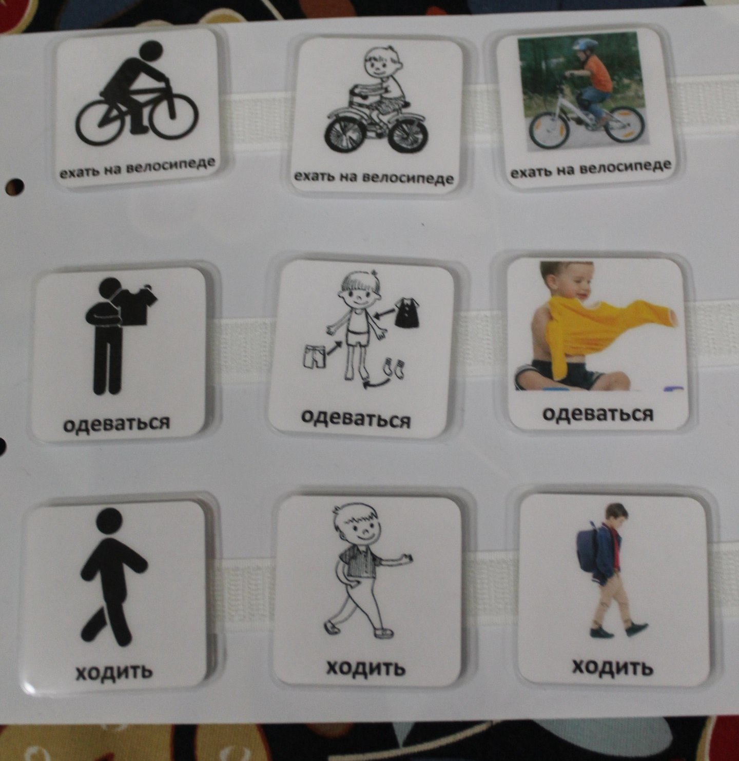 Пособие учит ребенка узнавать разные изображения одного и того же действия.