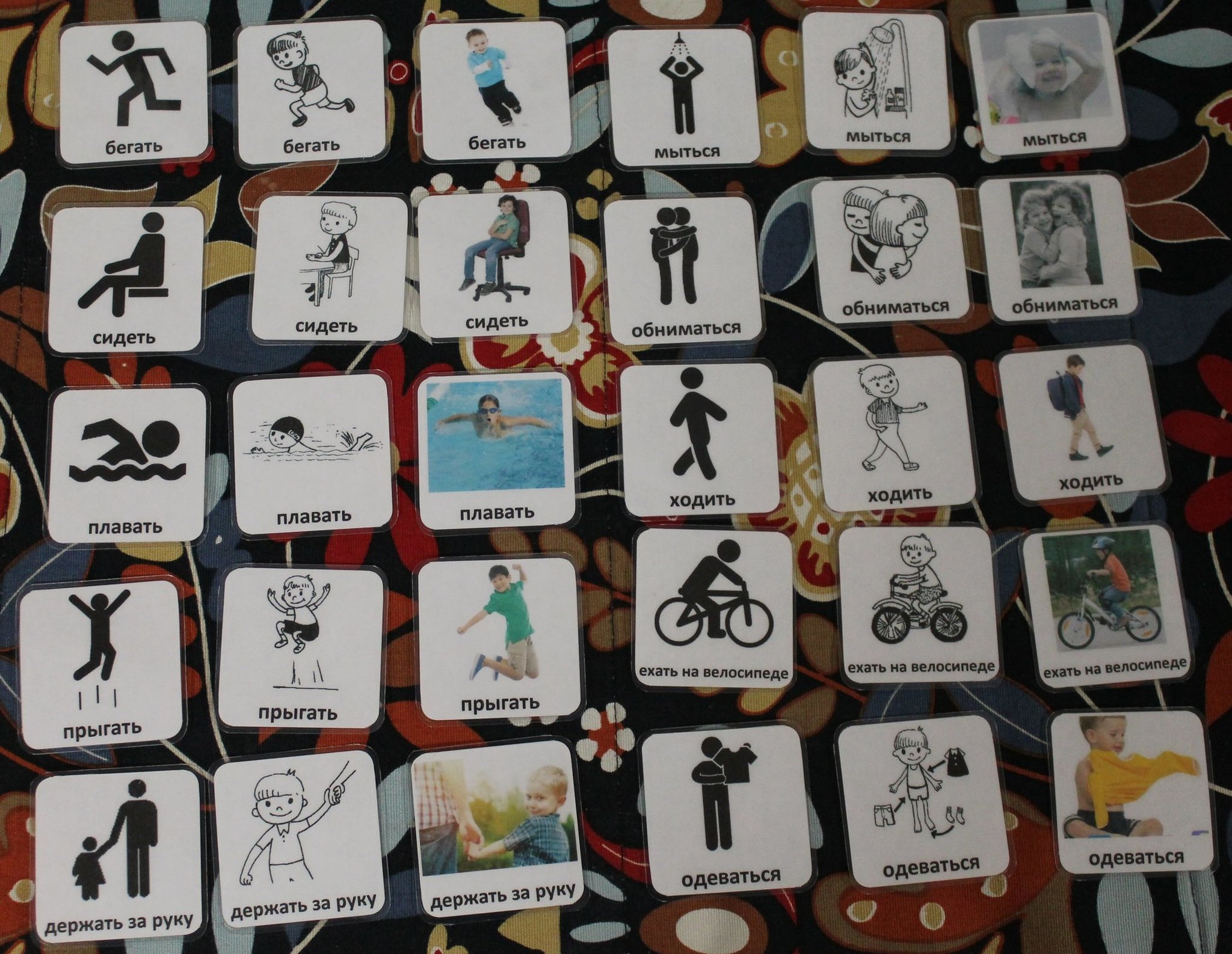 Представленные глаголы: Бегать, сидеть, плавать, прыгать, держать за руку, мыться, обниматься, ходить, ехать на велосипеде, одеваться.