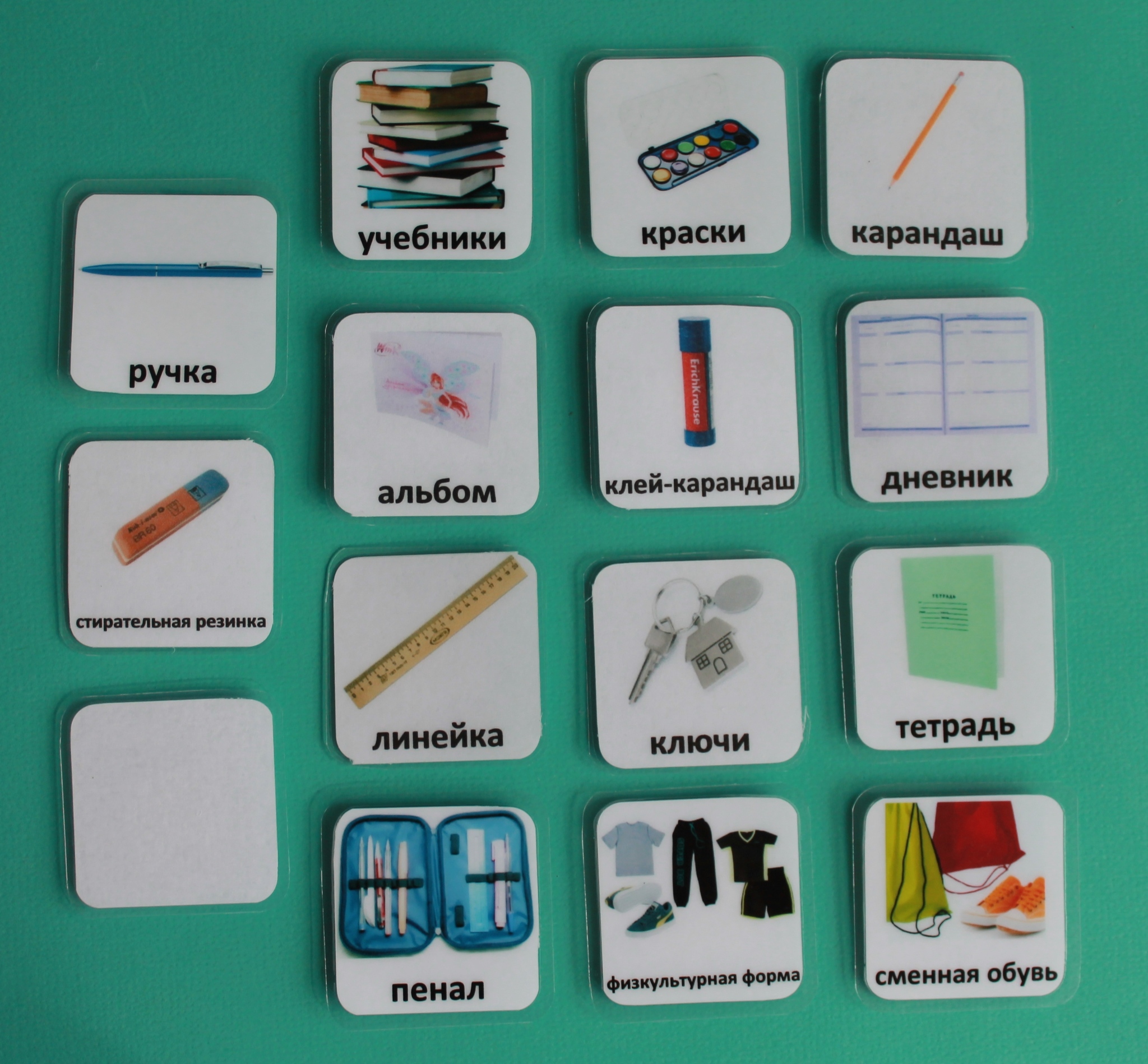 - 15 ламинированных карточек 4*4 см с липучкой (14 с изображением школьных принадлежностей + 1 пустая). На пустой карточке можно нарисовать или написать маркером необходимый Вам дополнительный предмет.