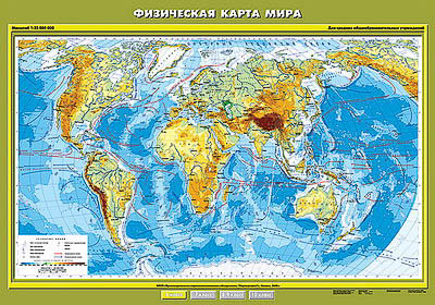 Карта содержит информацию о реках, озерах, отметках глубин и высот, вулканах, ледниках, морских течениях. Фоновой окраской даются формы рельефа суши и океанов.
