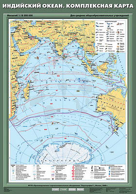Значками на карте показаны: средняя граница плавучих льдов, течения, граница Индийского океана, граница Индийского сектора Южного океана, природные пояса, полезные ископаемые на акваториях океана. Рисованными значками показаны места обитания млекопитающих в Индийском океане.Односторонняя печать, двустороннее ламинирование, лицевая сторона покрыта матовым ламинатом.