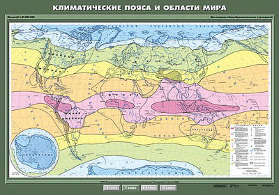 На карте цветными фонами показано среднегодовое количество осадков, линии равного количества осадков, изотермы июля и января, абсолютный максимум и минимум температур, направление ветров, зимняя граница плавучих льдов.Односторонняя печать, двустороннее ламинирование, лицевая сторона покрыта матовым ламинатом.