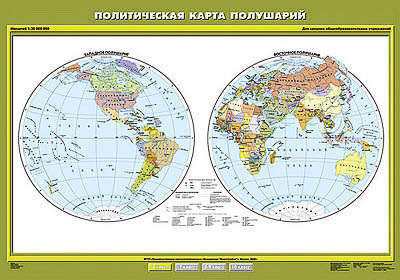 На карте полушарий фоном даны государства и территории мира. Односторонняя печать, двустороннее ламинирование, лицевая сторона покрыта матовым ламинатом.
