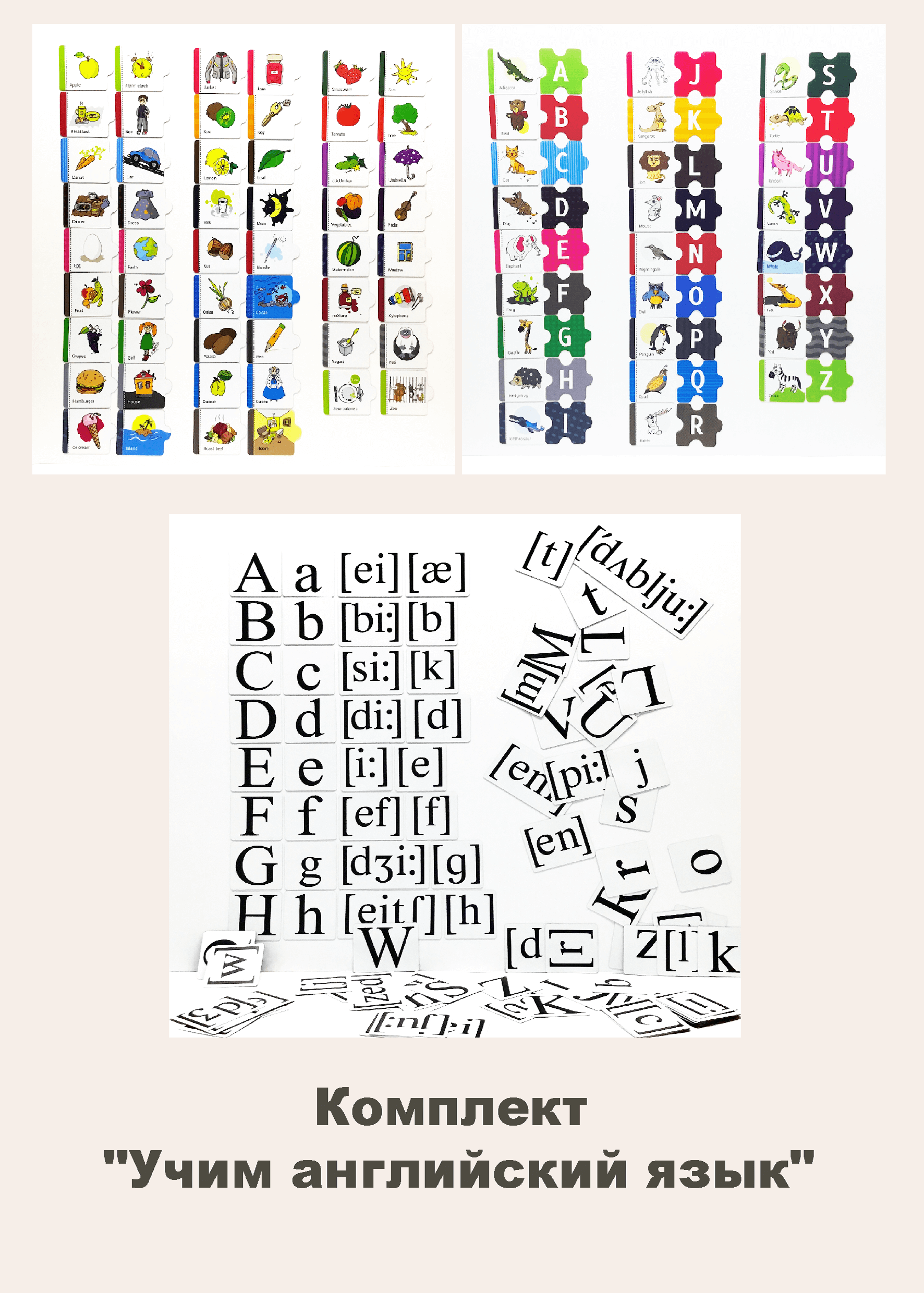 1. "Английский алфавит" (базовый комплект): магнитные карточки (буквы + животные) и вкладка с транскрипцией - 52шт. (размер карточек буквы 7 см х 8 см, картинки 7 см х 9 см). 2. "Английский алфавит" (дополнительный комплект): магнитные карточки (картинки с едой и картинки с важными словами) и вкладка с транскрипцией - 52шт. (размер 7 см х 9 см). 3. "Alphabet and transcription" (большой размер): магнитные карточки - 103шт. (размер от 7 см х 7 см до 7 см х 20 см).