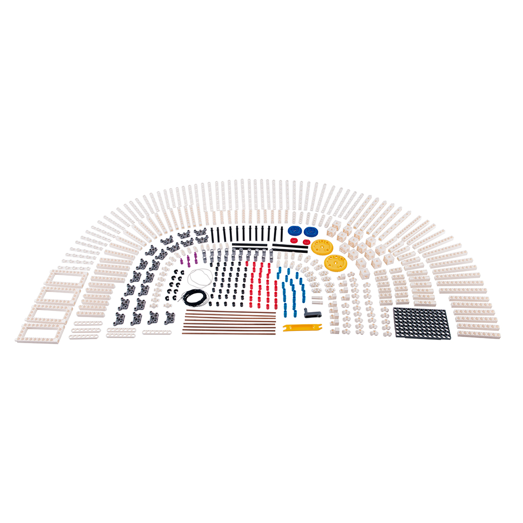 Комплектность: Полноценный набор деталей для конструирования мостов и зданий, включая специальные архитектурные элементы, колеса, гнущиеся пластины, рамы, оси, подшипники и крепления.