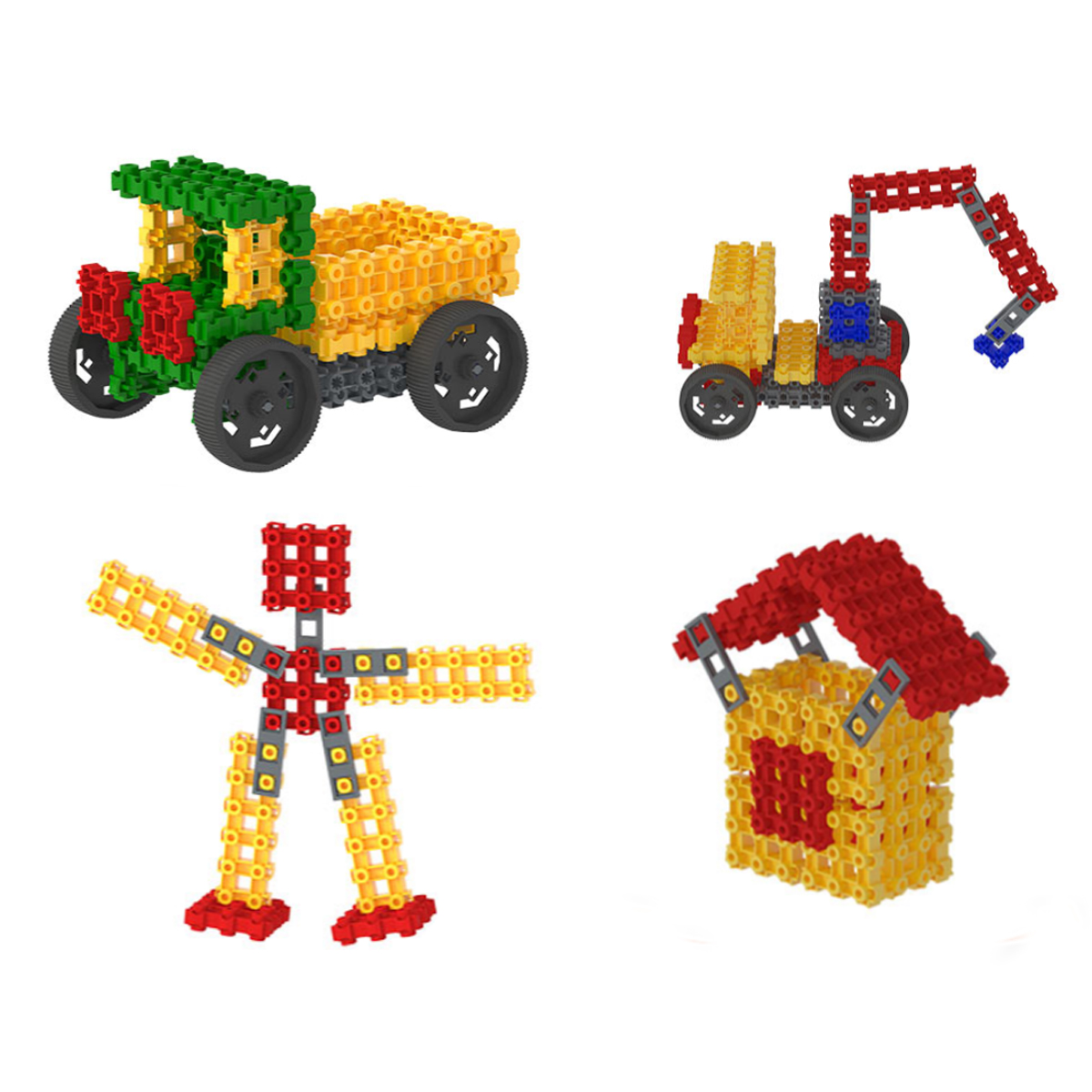Модели, которые можно собрать: дерево, самолет, грузовик, экскаватор,стул, стрекоза, человечек, вазочка, домик, щенок