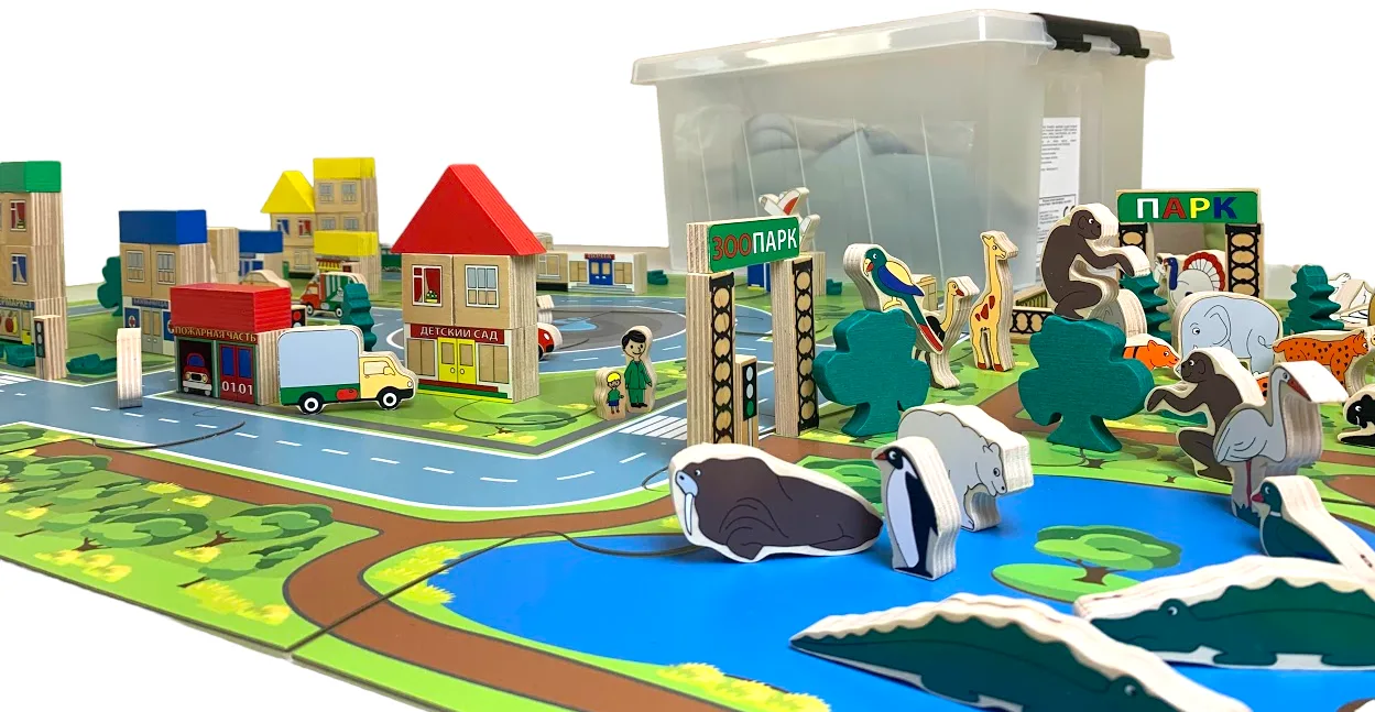 Такой конструктор поможет детям развивать фантазию, логическое мышление и умение работать в команде. Кроме того, конструктор " развивает у детей пространственное мышление и творческие способности. Он также помогает развивать мелкую моторику рук и координацию движений. Набор упакован в пластиковый контейнер, в который помещаются все детали, а также игровое поле для размещения зданий, исполненное в виде пазла.