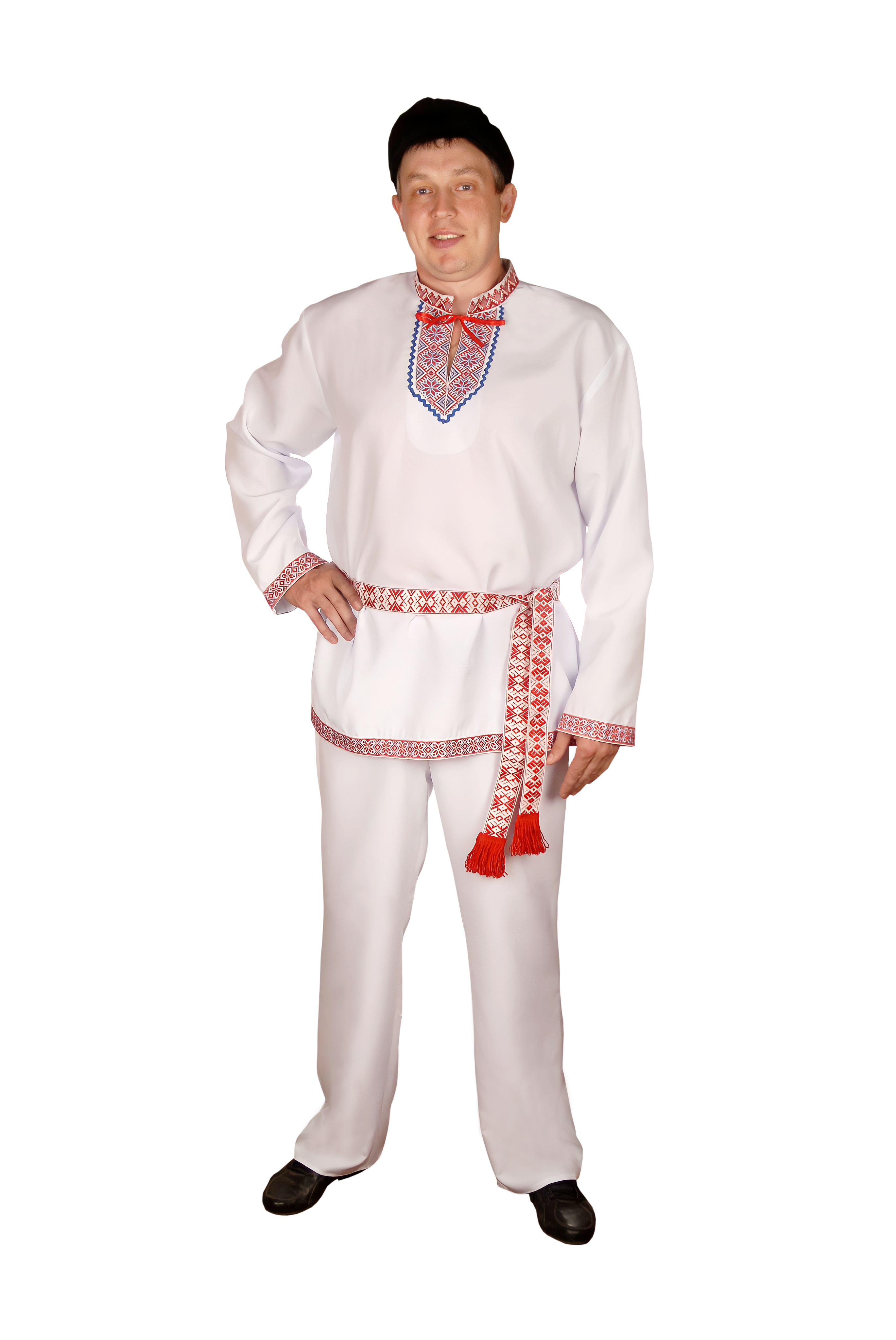 белый комплект: головной убор,рубаха, пояс, брюки.