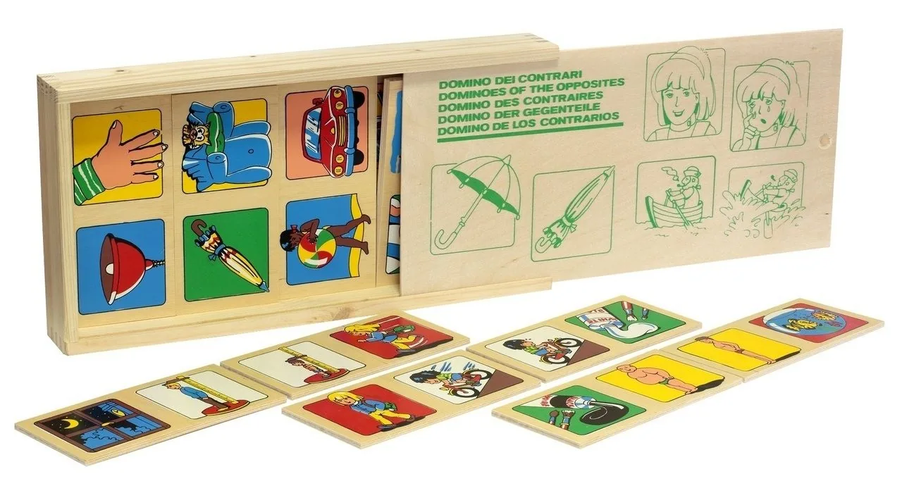 Настольная игра "Противоположности" включает: 20 деревянных прямоугольных карточек и деревянную коробку. На каждой карточке по 2 картинки. Карточки представляют противоположности, антитезы. Использован принцип познания на основе сравнения.