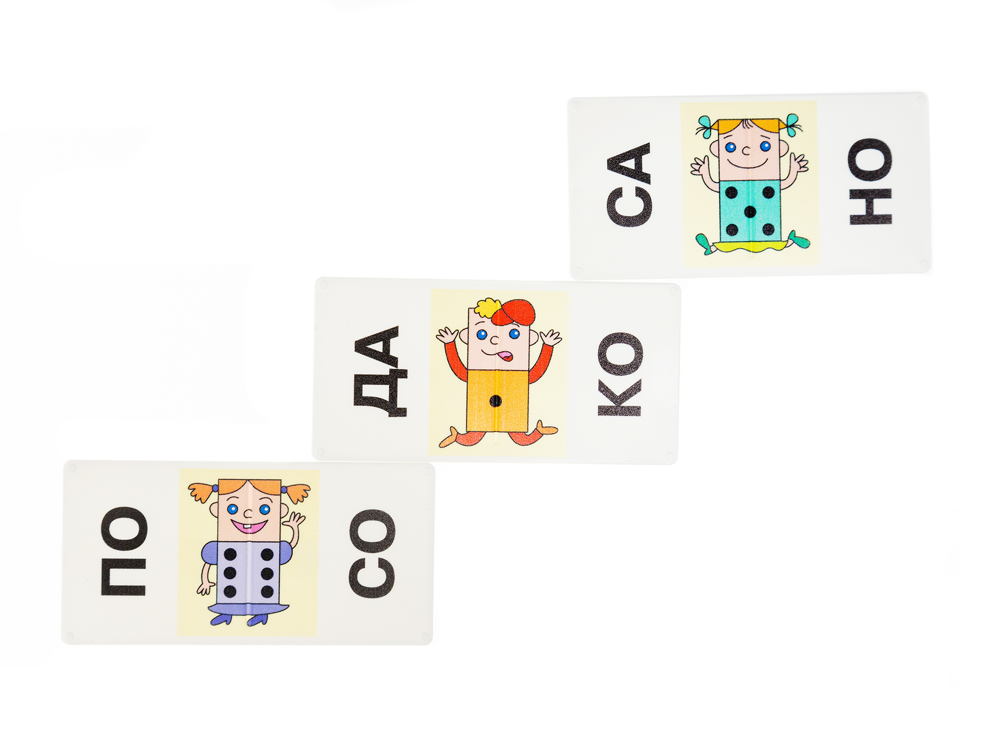 В состав умного домино «Читаем по слогам» входят 36 карточек, каждая из них разделена на две части. На каждой половинке написан слог. Смысл этой игры заключается в том, чтобы в игровой форме, участники игры складывали слова. Например: первый игрок выложил карточку со слогами РАН и ДУ, второй игрок может выложить (одну или две) свои карточки, таким образом, чтобы из слогов получилось слово БАРАНКА.