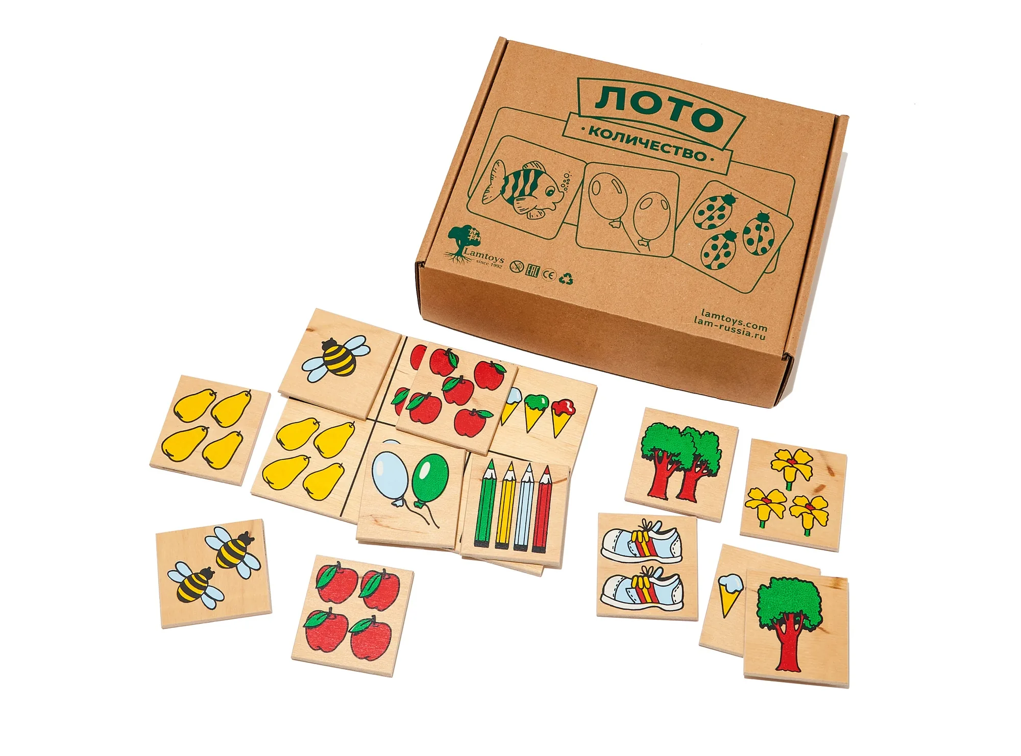 Карточки в количестве 24 штук и 4 таблицы лото размещены в картонной коробке. Таблицы размером 12,5*11,5*0,6 см содержат по 8 рисунков, на которых помещены рисунки с различными предметами в количестве изображений от 1 до 6.