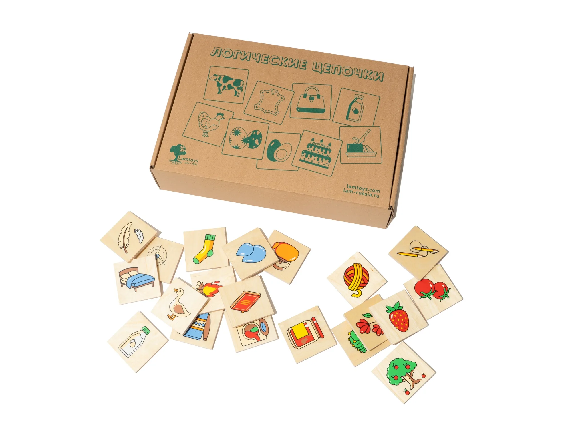 Настольная игра включает 72 деревянные квадратные карточки с тематической подборкой картинок и коробку. Игровая задача - разместить карточки по принципу домино в логической последовательности. Например: фермер - овечка - шерсть. Цепочку можно складывать в разных направлениях.
