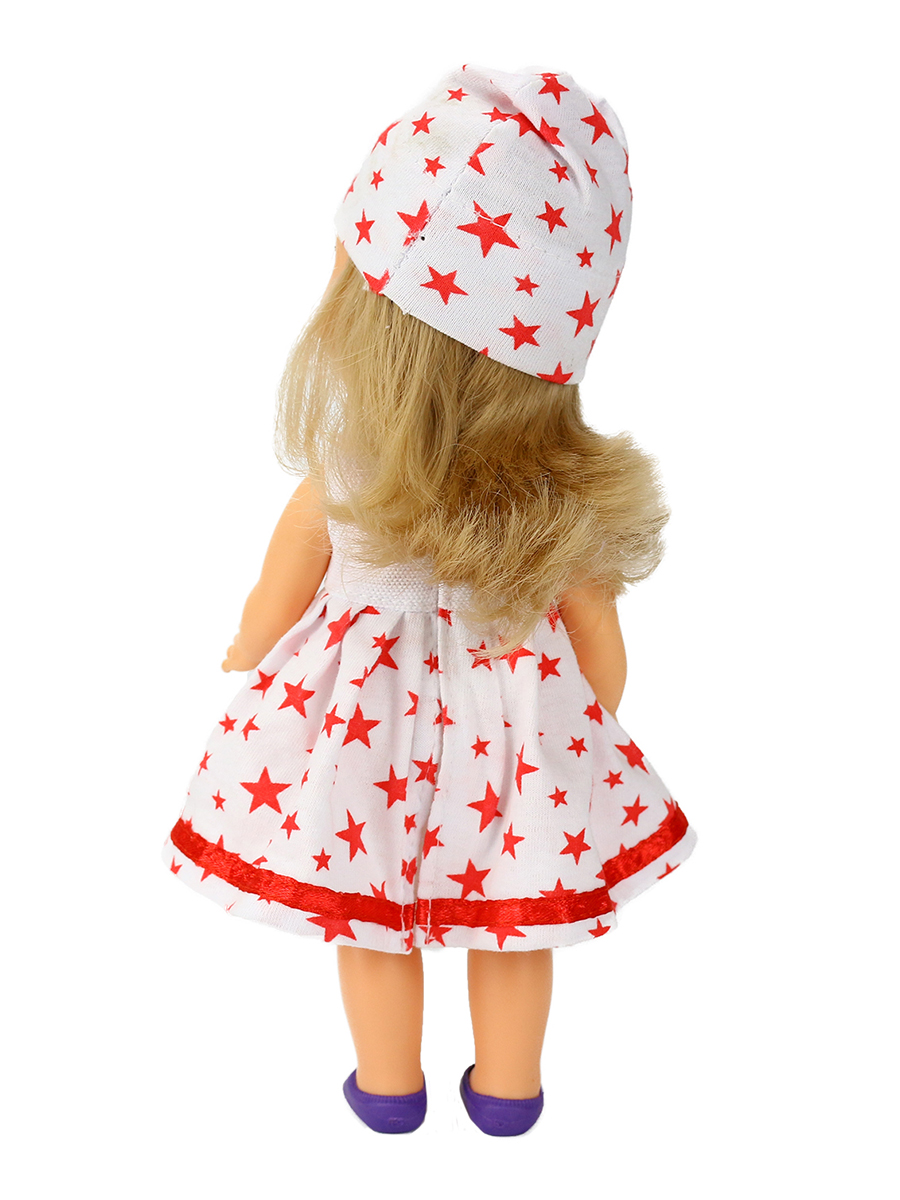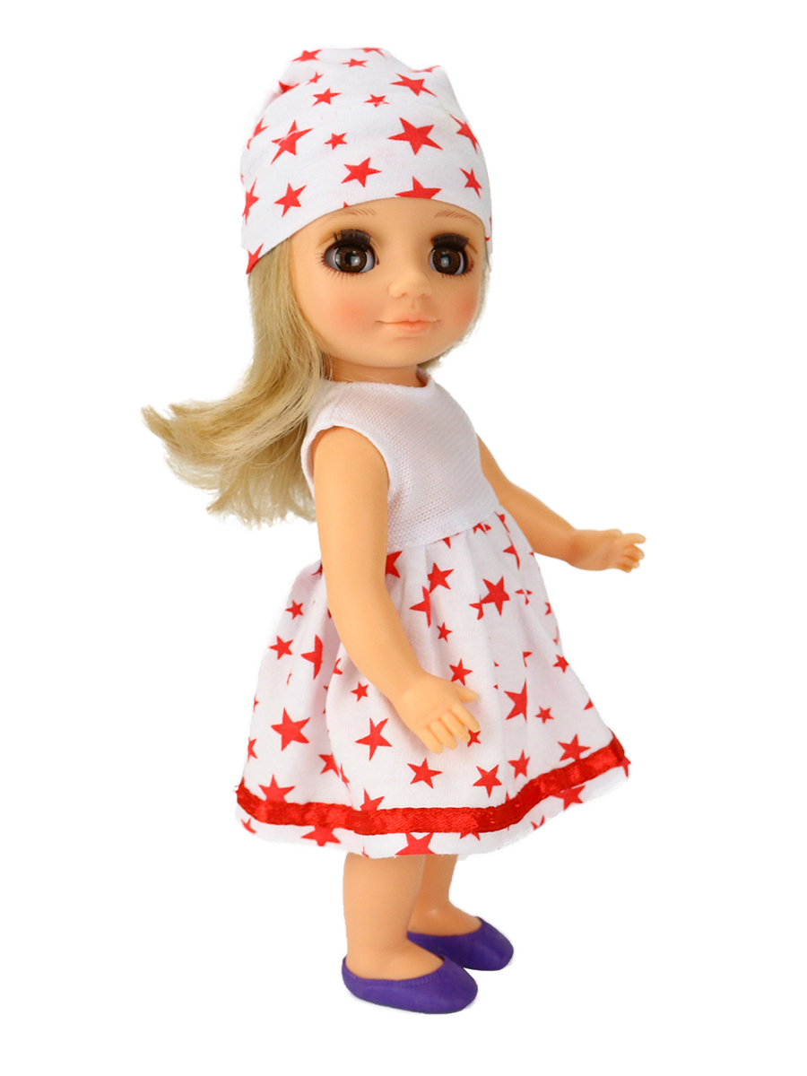 Кукла представлена в летнем комплекте одежды. Элегантное и милое безрукавое платье, отстроченное тесьмой по подолу. Подобраны в тон шапочка, носочки и туфельки.