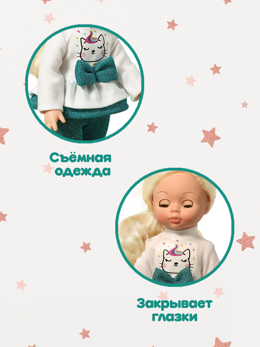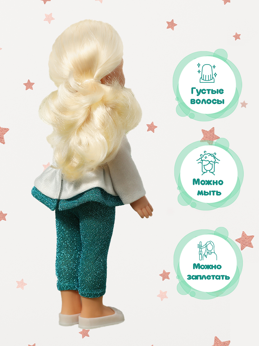 Рост куклы 30 см. Кукла Эля не озвучена. Глаза вставные закрывающиеся. Цвет глаз может варьироваться. Ручки и голова выполнены из эластичного, приятного на ощупь винила, а туловище и ноги из пластмассы.