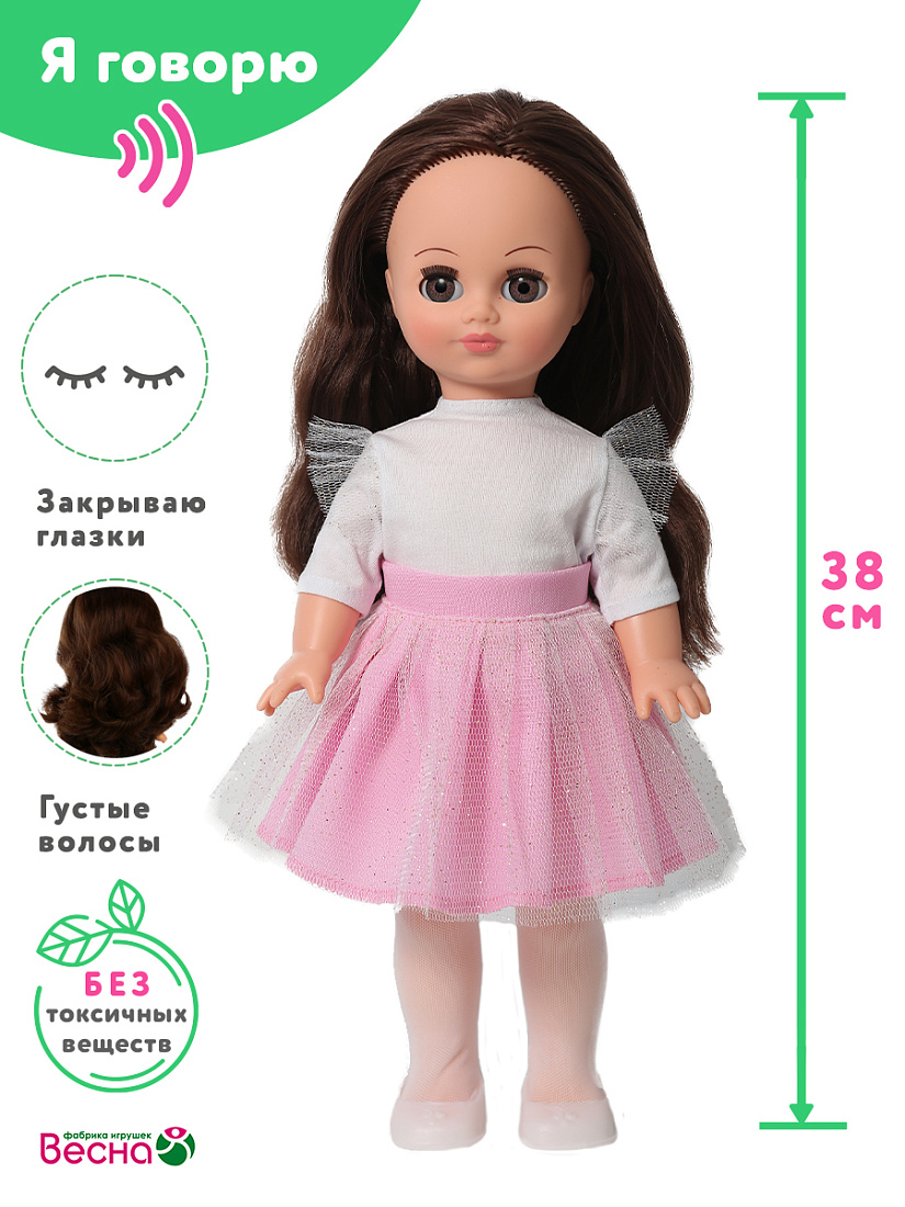 Элементы кукольной одежды, которые легко снимаются и надеваются, разнообразят возможности сюжетно-ролевых игр, в процессе которых развивается мелкая моторика и творческое воображение ребёнка. кукла озвучена. Кукла озвучена, говорит несколько фраз (до 8 фраз), активирующих к игровой деятельности.
