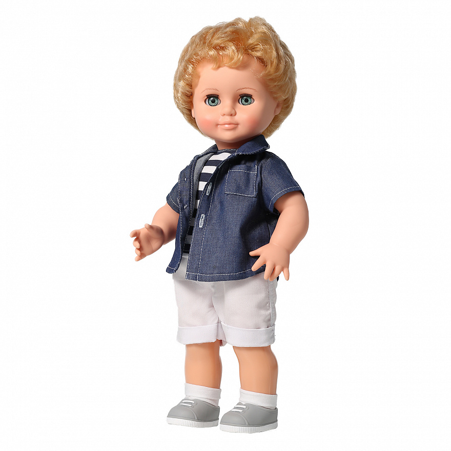 Комплект одежды куклы состоит из рубашки из сорочечной ткани, с короткими рукавами, отложным воротником, застёжкой спереди на 3 пуговки, трикотажной футболки с короткими рукавами, шорт ниже колена из джинсовой ткани, трикотажных носков. Обувь - кроссовки.