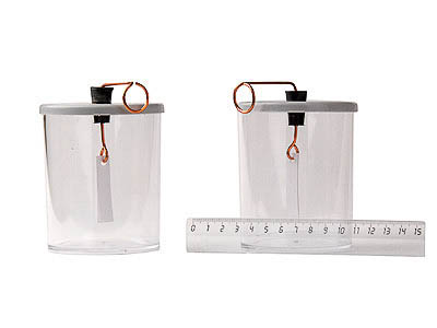 Электроскоп состоит из двух бумажных листков, подвешенных на проволочной петле. Петля с листками вставлена в изолирующую пробку, которая закреплена в прозрачном пластиковом стакане. Длинный конец проволочной петли выведен наружу через пробку, скручен в кольцо и согнут так, что выступает за край стакана.