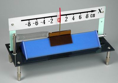 Прибор состоит из основания с полой треугольной призмой, на гранях которой имеются ряды равноудаленных друг от друга маленьких отверстий. На торце призмы установлен штуцер для присоединения эластичного шланга, через который нагнетается воздух от воздуходувки. Над призмой прибора установлена горизонтальная оцифрованная шкала «-8-0-8». На гранях призмы находится пластмассовая каретка, соединенная с пружиной, обеспечивающей колебательные движения. Предусмотрена возможность менять массу каретки за счет дополнительных грузов. Прибор позволяет провести следующие опыты: свободные колебания горизонтального пружинного маятника; движение по инерции; упругий и неупругий удар; равномерное прямолинейное движение – движение с постоянной скоростью; определить энергию свободных колебаний.