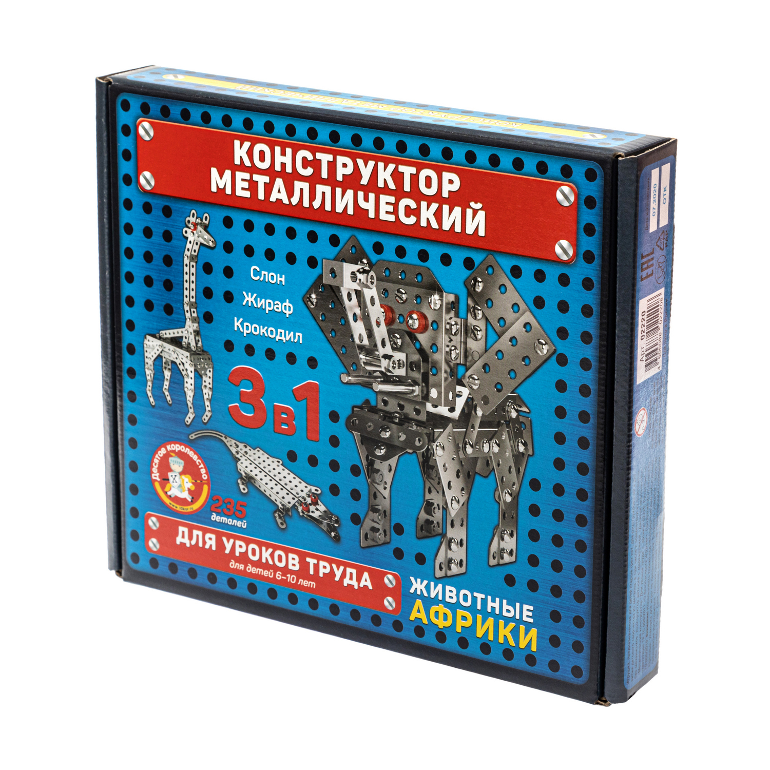 Конструктор металлический «Животные Африки» для уроков труда (слон, жираф и крокодил). Состав набора (всего 235 деталей): детали конструктора – 233 шт., гаечный ключ – 1 шт., отвёртка – 1 шт., инструкция. Материал: металл, пластик, бумага. Конструктор предназначен для детей 6–10 лет. Занятия с металлическим конструктором способствуют развитию мелкой моторики рук, осязания, воображения, логики и пространственного мышления, а также закладывают основы знаний по моделированию.