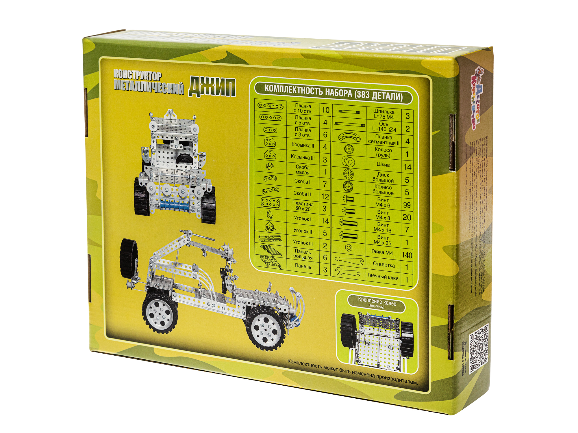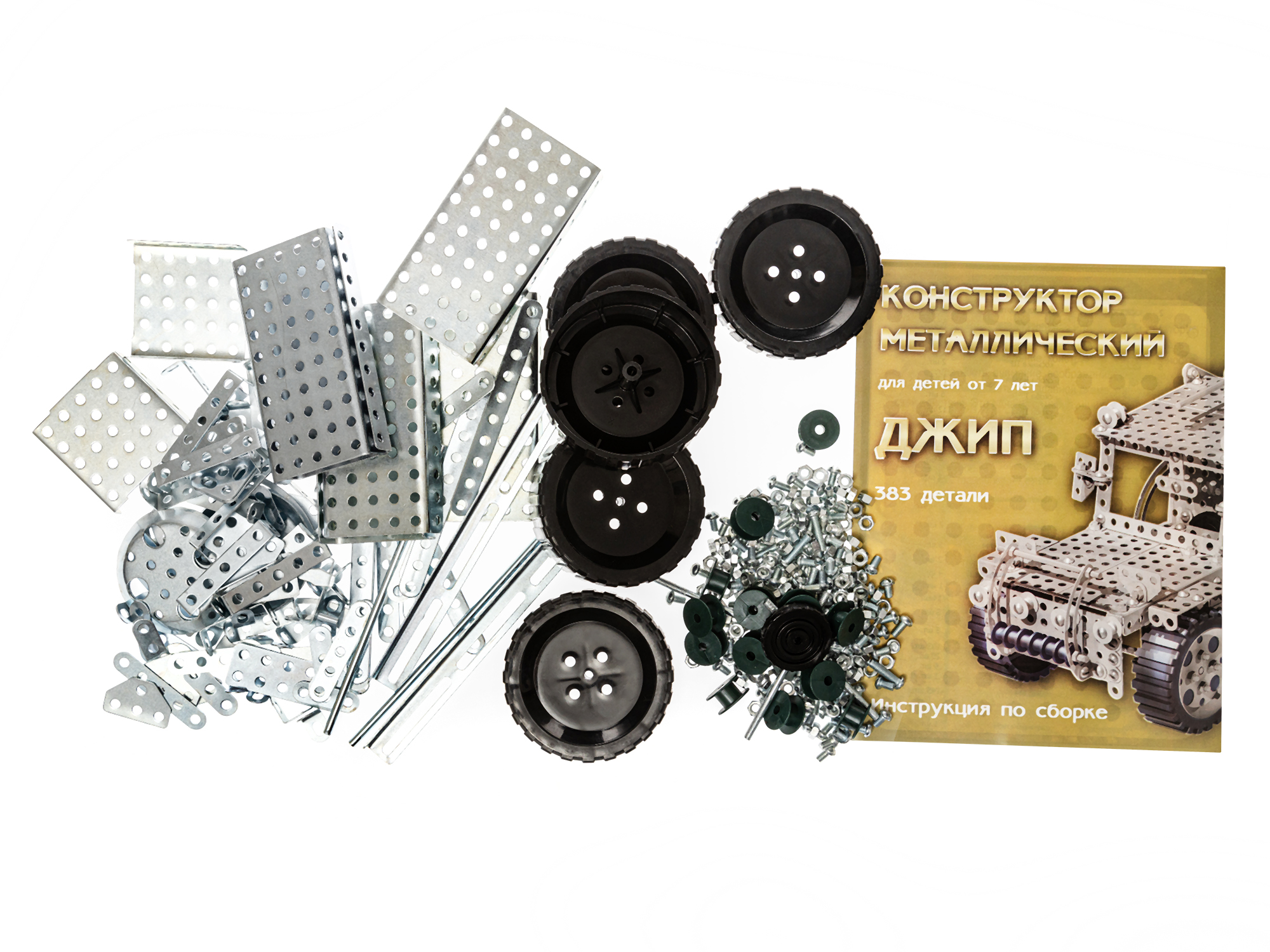 Детский металлический конструктор для мальчиков «Джип» состоит из 383 деталей и предназначен для «продвинутых конструкторов» от 6 лет и старше. Кроме металлических деталей в набор входят пластиковые и пластмассовые детали. Как и во всей группе конструкторов «Как раньше» , конструкция достаточно сложная, поэтому машина получится не сразу, и, возможно, вам придется даже вмешаться в процесс и помочь ребенку. Старайтесь только подсказывать, чтобы малыш основную работу делал сам. Металлический конструктор - это хорошая развивающая игрушка. В процессе сборки развивается не только мелкая моторика рук, но и пространственное мышление, ребенок учится пользоваться не только ключом и отверткой, но и инструкцией по сборке, в которой, в принципе, достаточно подробно показана последовательность операций. А собрав готовую модель, Ваш малыш получит массу положительных эмоций от того, что машина у него получилась "как настоящая", с вращающимися колесами.
