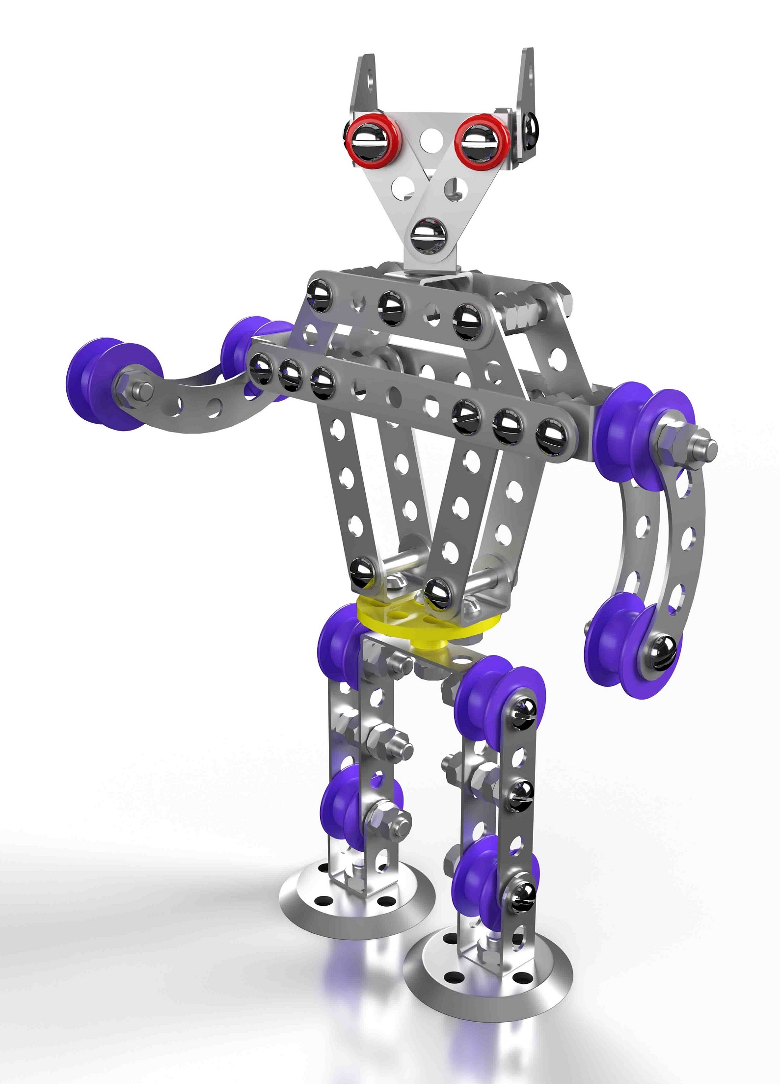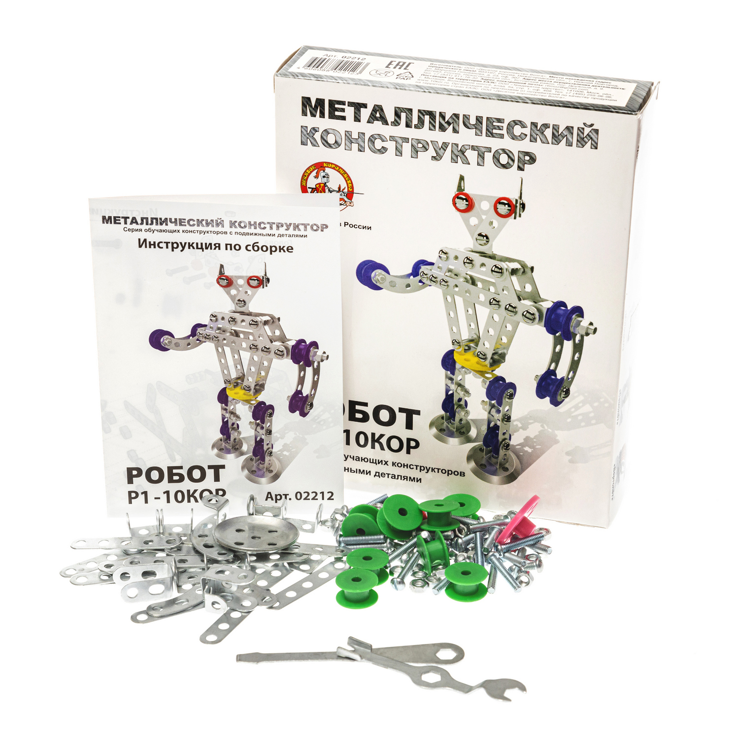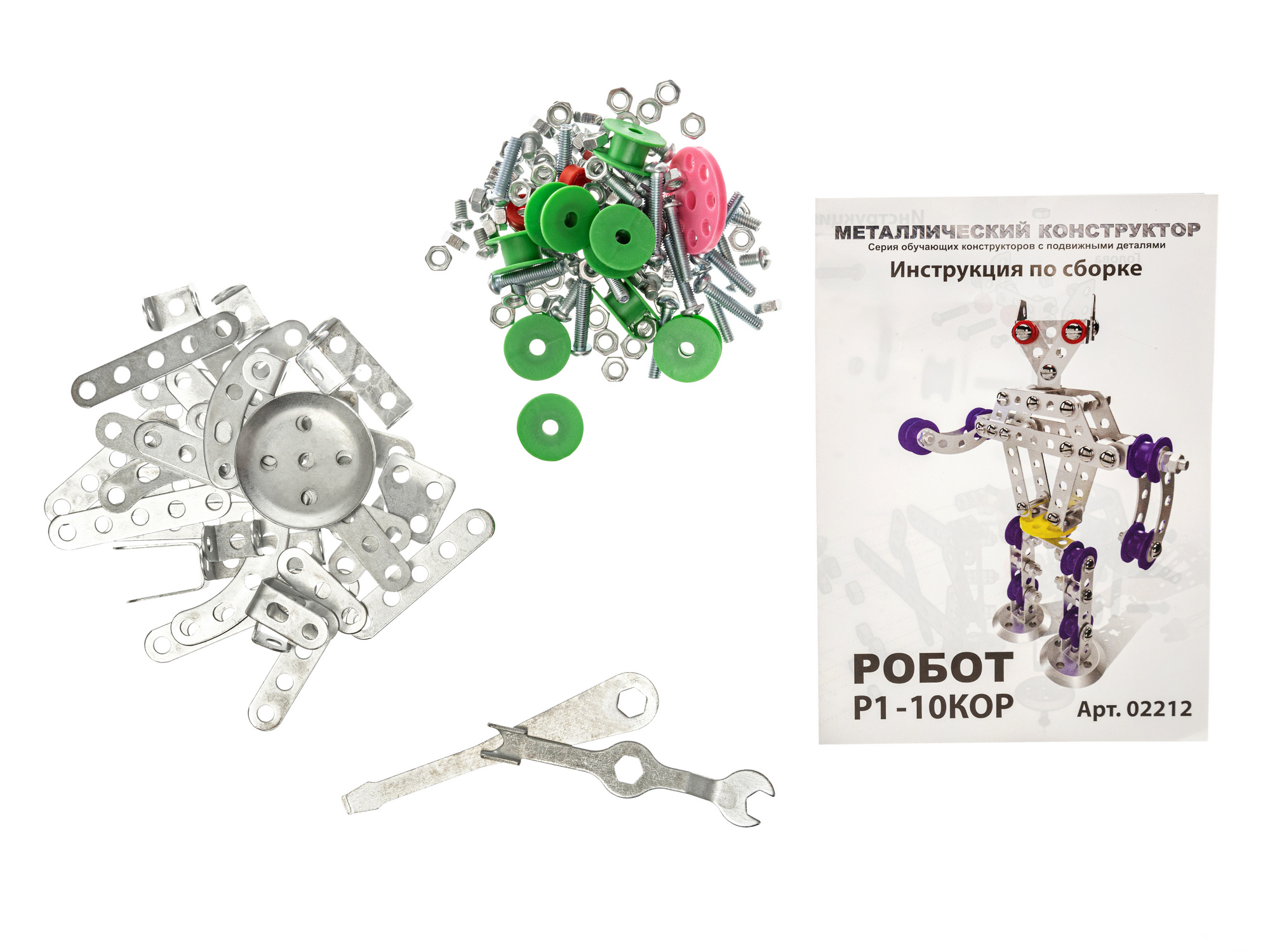 В финале сборки получается подвижная модель робота высотой 18 см. Состав набора: планка с 9 отверстиями – 2 шт., планка с 5 отверстиями – 10 шт., планка с 3 отверстиями – 6 шт., полукруглая планка с 5 отверстиями – 4 шт., узкая планка с бортиками – 2 шт., широкая планка с бортиками – 2 шт., планка-уголок с 3 отверстиями – 2 шт., круглая планка с 5 отверстиями – 2 шт., пластмассовый диск – 1 шт., пластмассовые гайки – 8 шт., винт М4 х 6 – 9 шт., винт М4 х 16 – 5 шт., винт М4 х 20 – 18 шт., гайки металлические – 80 шт., отвёртка – 1 шт., инструкция со схемой сборки. Материалы: металл, пластмасса. Развивает конструкторские навыки, усидчивость, мелкую моторику, логическое и пространственное мышление. Обучает основам моделирования.