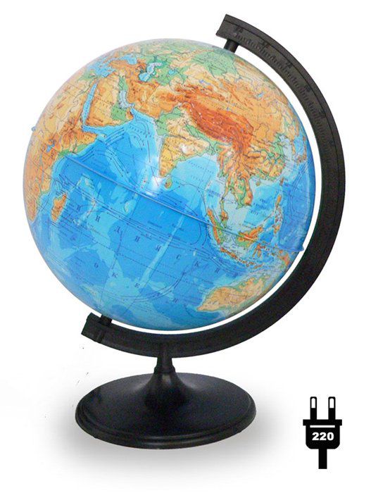 Точный физический глобус Земли с подсветкой, диаметром 320 мм. Установлен на черной пластиковой подставке.