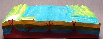 Модель неразборная, изготовлена из пластмассы и раскрашена. На модели и ее срезах показано изменение пластов земной коры под морем в результате вулканической деятельности.