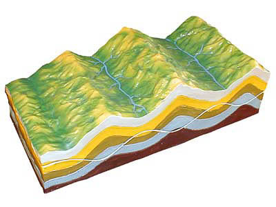 Изображает строение земных складок и эволюций рельефа. На модели показаны: горные хребты, вершины, глубокие межгорные долины, горные реки и разрез складчатого строения.