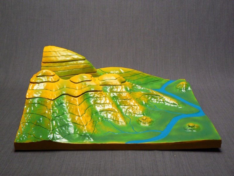 Модель разборная, состоит из 7 частей, накладывающихся друг на друга. Изготовлена из пластмассы и раскрашена в естественные цвета. На модели проведены замкнутые продольные линии, отмечающие определенную высоту местности над уровнем нулевой отметки в данном районе.