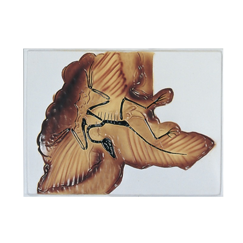 Модель изготовлена из пластмассы путём вакуумного формования. Изображает слепок с археологической находки. Модель раскрашена в соответствии с археологической находкой археоптерикса, найденного в отложениях середины мезозойской эры. На модели изображен отпечаток археоптерикса. Эта первоптица представляет собой переходную форму, имеющую в своем строении признаки птицы с сохранившимися еще чертами пресмыкающегося. Находка археоптерикса в сланцах юрского периода мезозойской эры представляет большой интерес с эволюционной точки зрении.