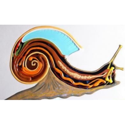 Модель изготовлена из пластмассы путём вакуумного формования. Изображает внутреннее строение брюхоногого моллюска (на примере виноградной улитки), которое можно рассмотреть на сагиттальном разрезе тела животного. На модели видны следующие органы брюхоногого моллюска: