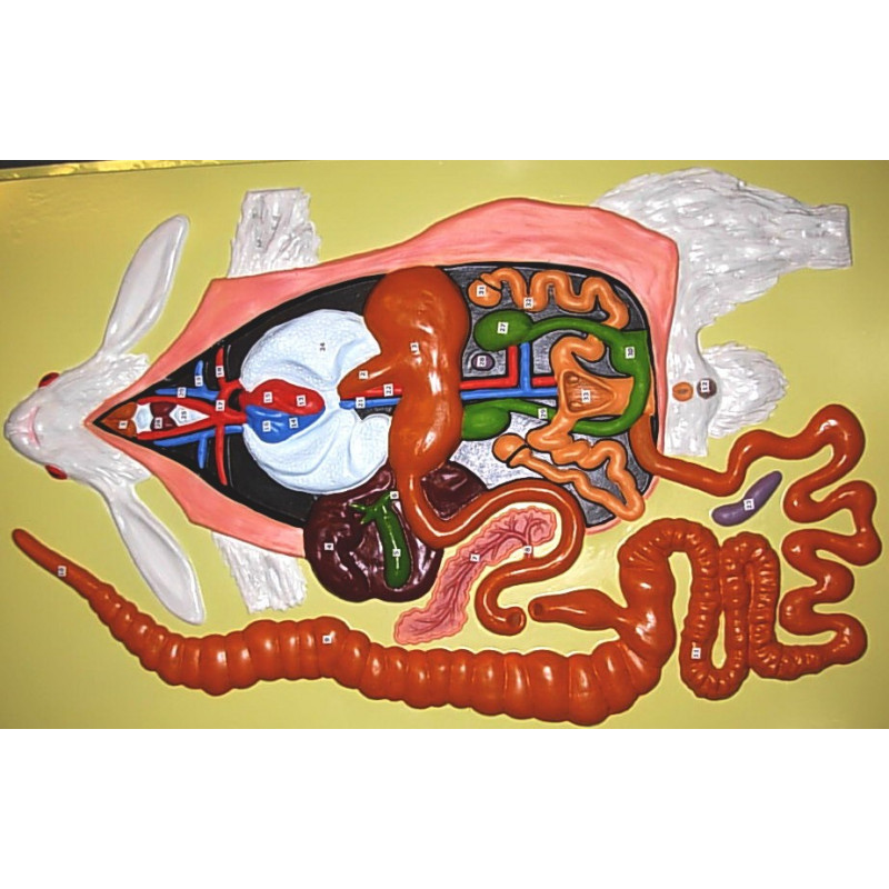На модели изображена самка кролика, со вскрытой брюшной полостью. На барельефной модели можно рассмотреть следующие системы органов: