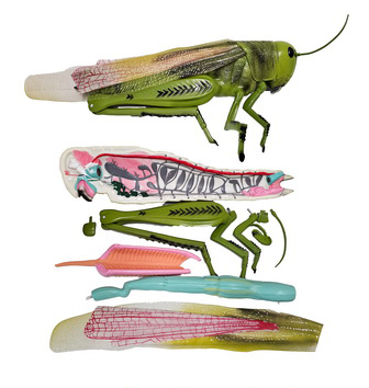 Модель изготовлена из пластмассы, разборная, цветная, демонстрирует увеличенную модель кузнечика в разрезе (продольный разрез), на которой можно рассмотреть внешнее и внутреннее строение насекомого: голова, глаз, глазок, усик, верхняя губа, нижняя губа, передняя грудь, передняя нога, средняя грудь, средняя нога, задняя грудь, задняя прыгательная нога (бедро, голень, лапка, ноготок), шипики на ногах, брюшко, орган слуха, надкрылье, крыло, головной мозг, рот, глотка, слюнные железы, окологлоточный нервный узел, брюшная нервная цепочка, пищевод, желудок, кишечник, прямая кишка, анальное отверстие, дыхальца, сердце, трахеи, аорта, яичник, яйцеводы парные, семяприемник, яйцеклад.