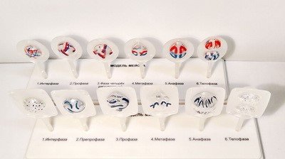 Вторая часть моделей клеток (6шт.) демонстрирует первое деление мейоза. На моделях клеток цветом обозначены гомологичные хромосомы. Изделие упаковано в коробку с маркировкой.