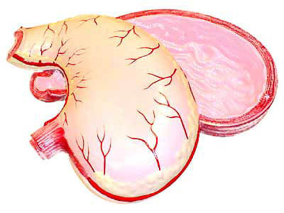 Модель изготовлена из пластмассы, является разборной, изображает желудок человека в разрезе, демонстрирует строение внешней и внутренней стенок желудка. Модель раскрашена.