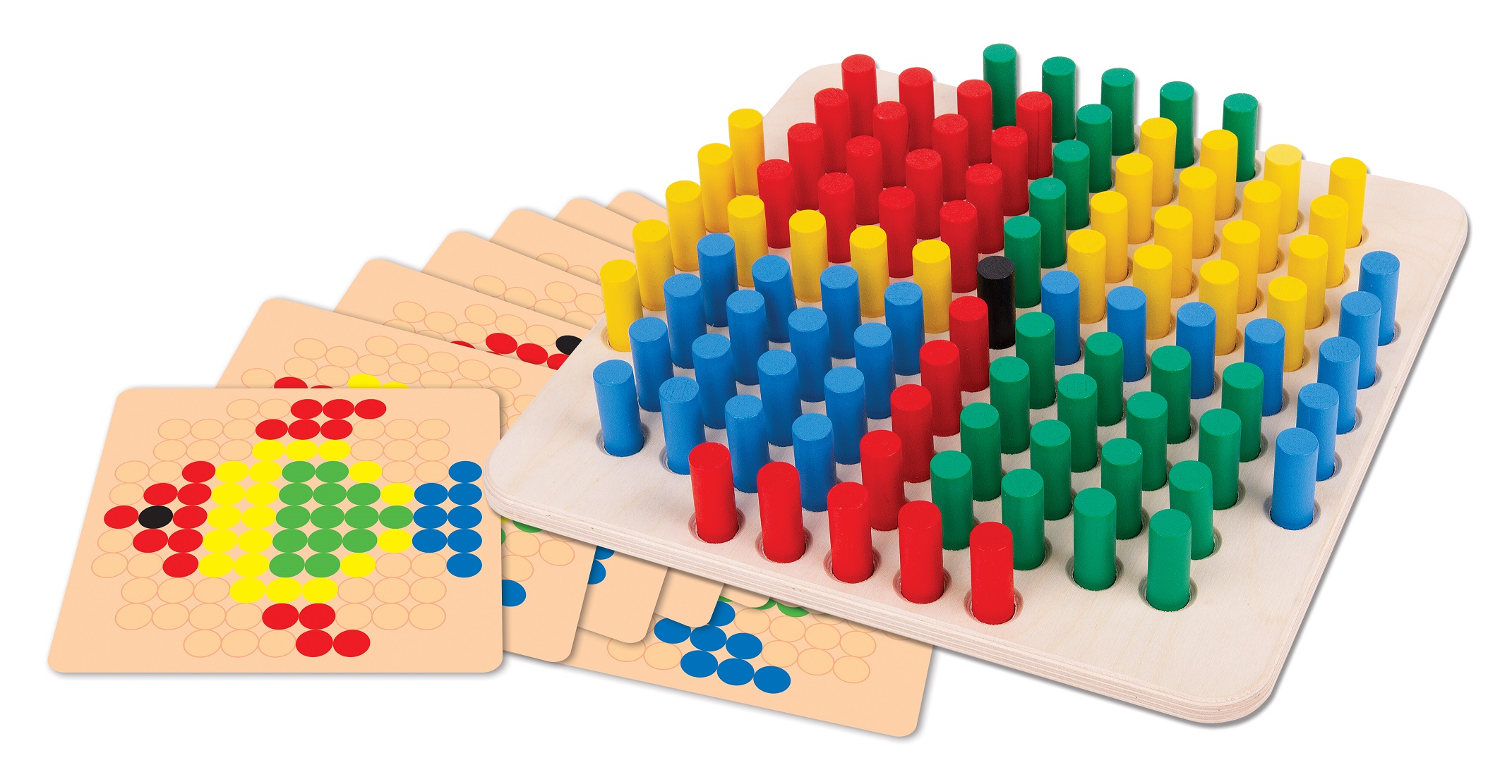 Развивающая игра из дерева «Весёлые столбики». 3+. Состав: деревянное поле с углублениями для столбиков – 1 шт. (29,5 х 29,5 см, толщина – 1,2 см; всего на поле 101 углубление диаметром 1,5 см), деревянные столбики 5-и цветов – 101 шт. (длина – 4 см, диаметр – 1,4 см; цвета – красный, жёлтый, зелёный, синий, чёрный – 1 шт.), двухсторонние карточки с заданиями – 8 шт. (11 х 11 см). Всего даны 16 заданий. Материалы: дерево, картон. Задача ребёнка: повторить схему с карточки с заданием и расставить правильным образом столбики на поле (нужно соблюсти место положения столбиков, цвет и количество). Игра развивает логику и мелкую моторику.