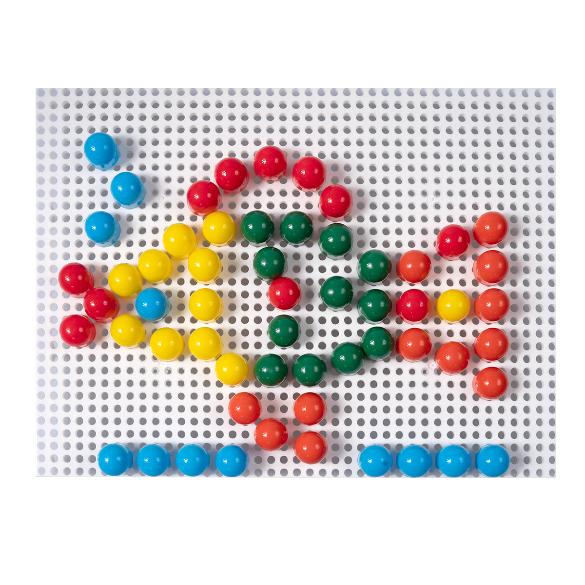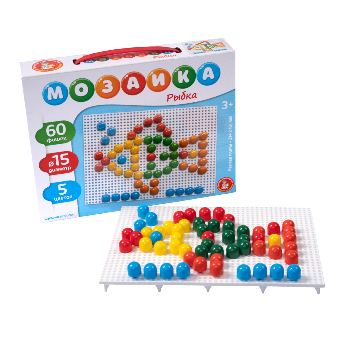 Мозаика для малышей «Рыбка» (60 эл.). Состав: плата – 1 шт. (16,5 х 21,5 см), цветные фигурные фишки – 60 шт. (5 цветов: красный, зелёный, оранжевый, жёлтый, синий; диаметр – 1,5 см). Материал: пластмасса. Для детей от 3 лет. Работая с мозаикой, ребёнок развивает воображение, внимательность и логику, тренирует мелкую моторику рук, а также усваивает такие понятия, как часть и целое, и учится различать цвета.