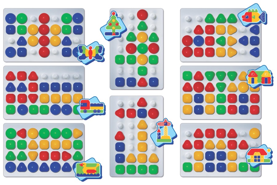 «Пчёлкина мозаика». Состав: плата белого цвета на 28 фишек – 1 шт. (348 х 233 мм), фишки пяти цветов – 60 шт. (40 мм). Материал: пластмасса. Для детей от 3 лет.