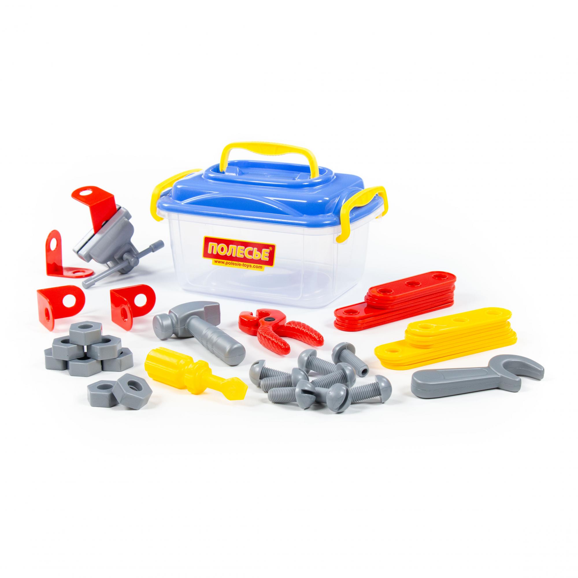 Набор для мальчиков, состоящий из отвертки, гаечного ключа, пассатижей, молотка, слесарных тисков, а также соединительных пластин, уголков, винтов и гаек.