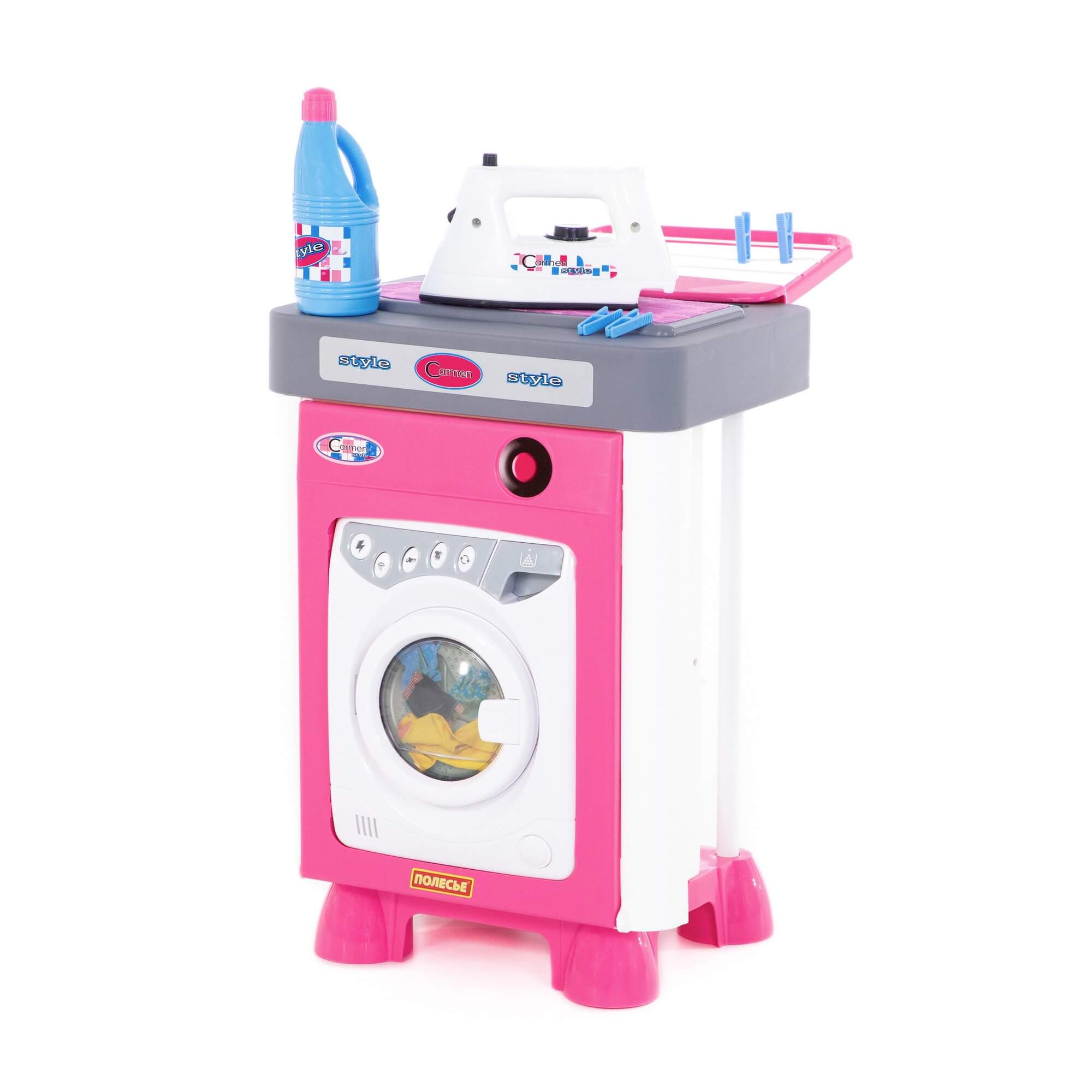стиральную машину Открытие и закрытие дверки стиральной машины сопровождается звуковым сигналом. После выбора режима стирки начинает вращаться барабан и звучит звуковой сигнал, имитирующий работу стиральной машины.;